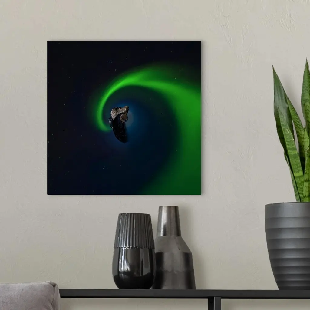 Swirling green aurora borealis, with a stereographic projection effect on the image, resembling a tiny planet.