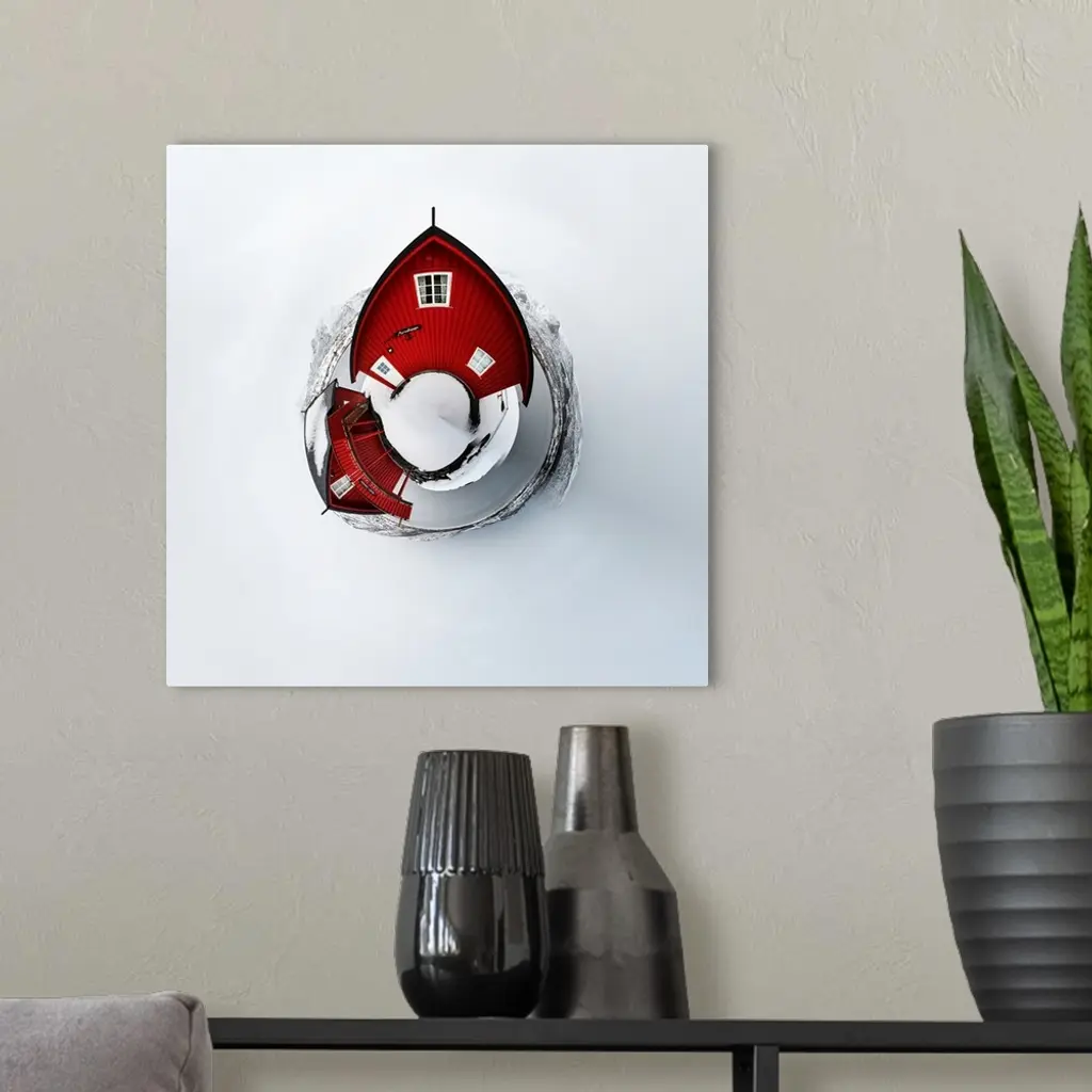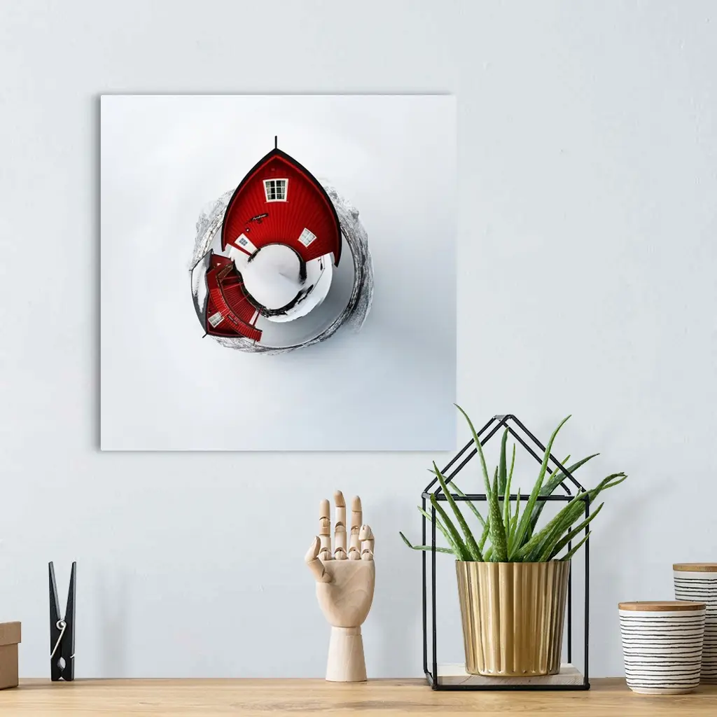 A bright red barn standing out against the stark white snow, with a stereographic projection effect on the image, resembling a tiny planet.