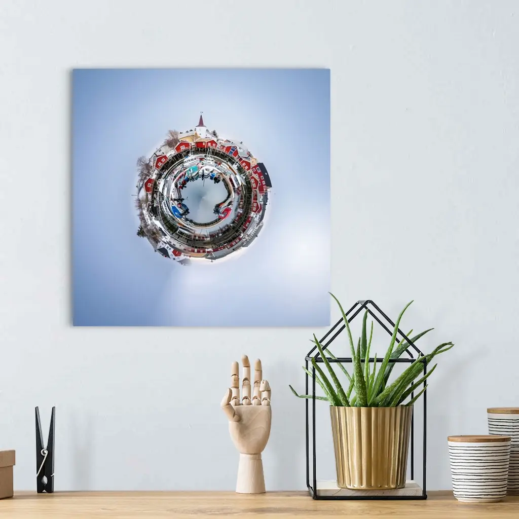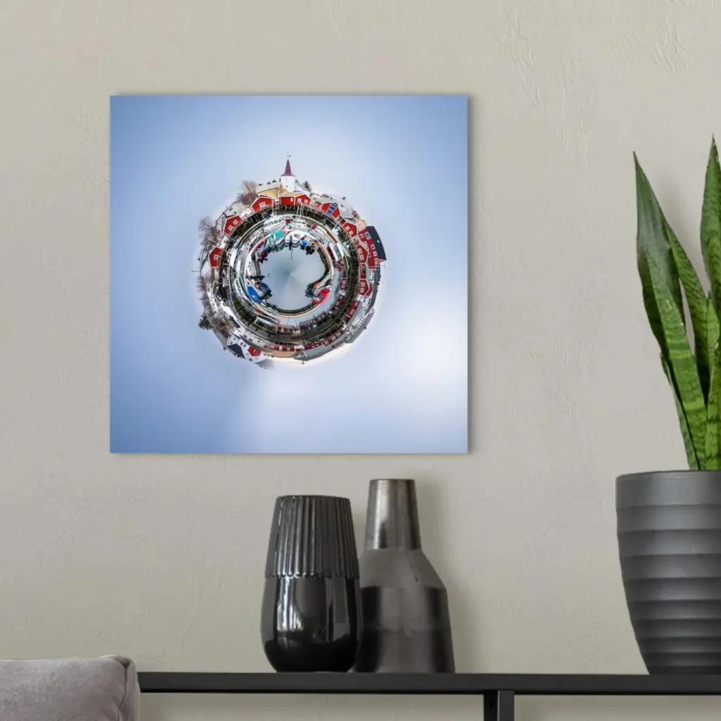 Several red fishing shacks at the edge of a seaside town, with a stereographic projection effect on the image, resembling a tiny planet.