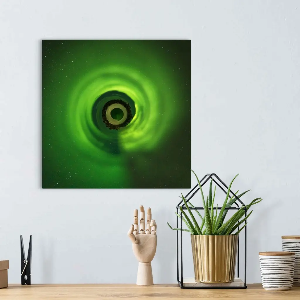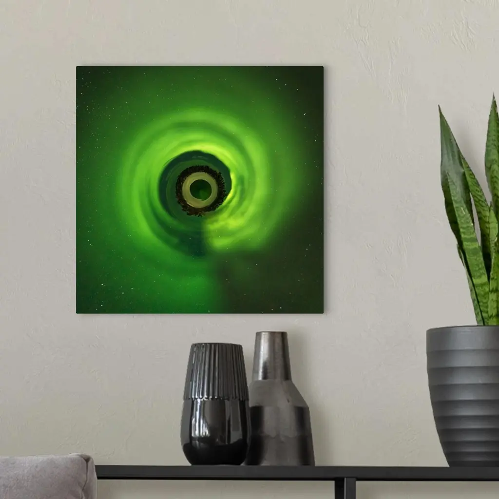 Stunning green aurora borealis in the sky, with a stereographic projection effect on the image, resembling a tiny planet.