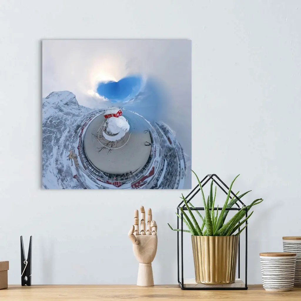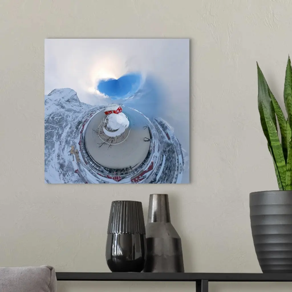 A red barn surrounded by tall mountains in the winter, with a stereographic projection effect on the image, resembling a tiny planet.
