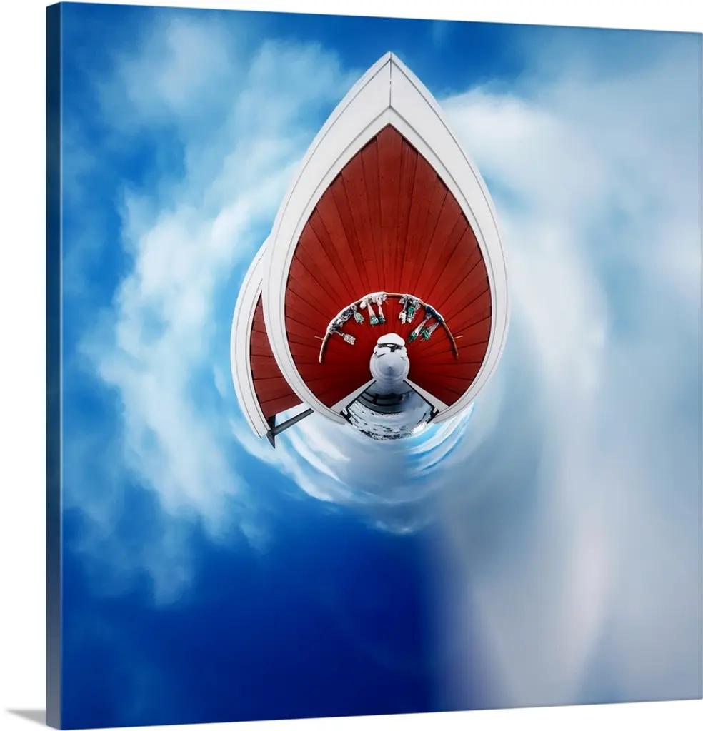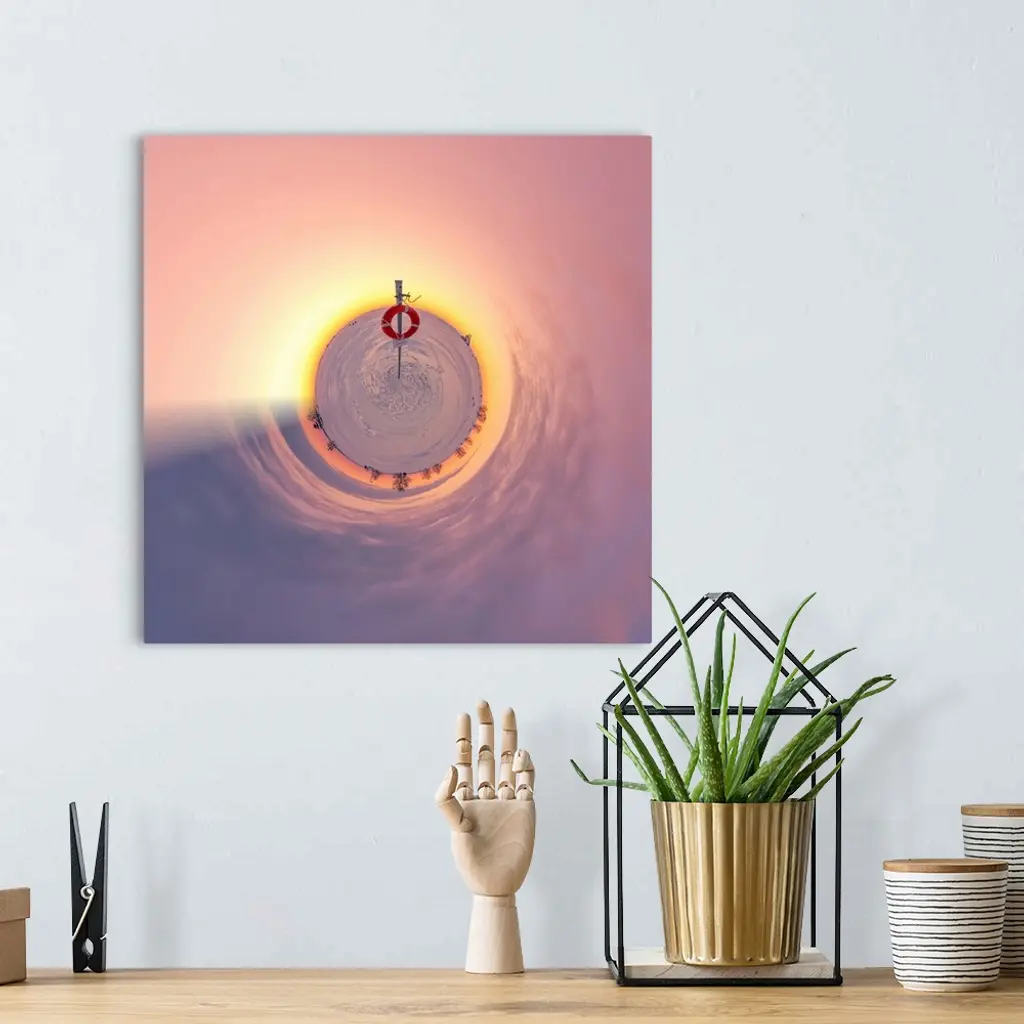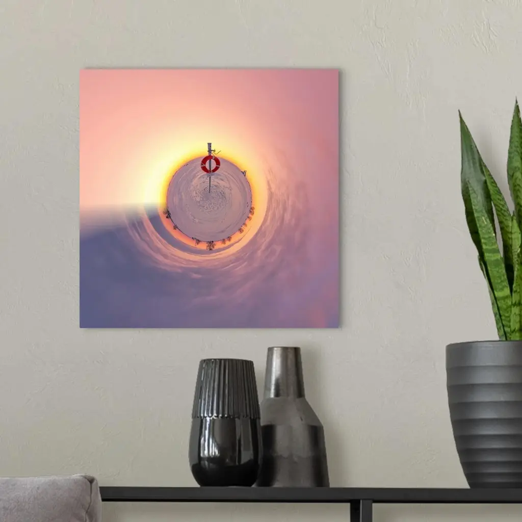 Colorful sunrise turning the sky pastel pink and purple, with a stereographic projection effect on the image, resembling a tiny planet.