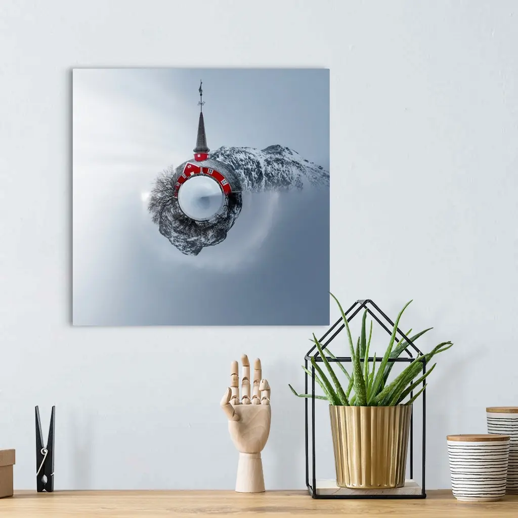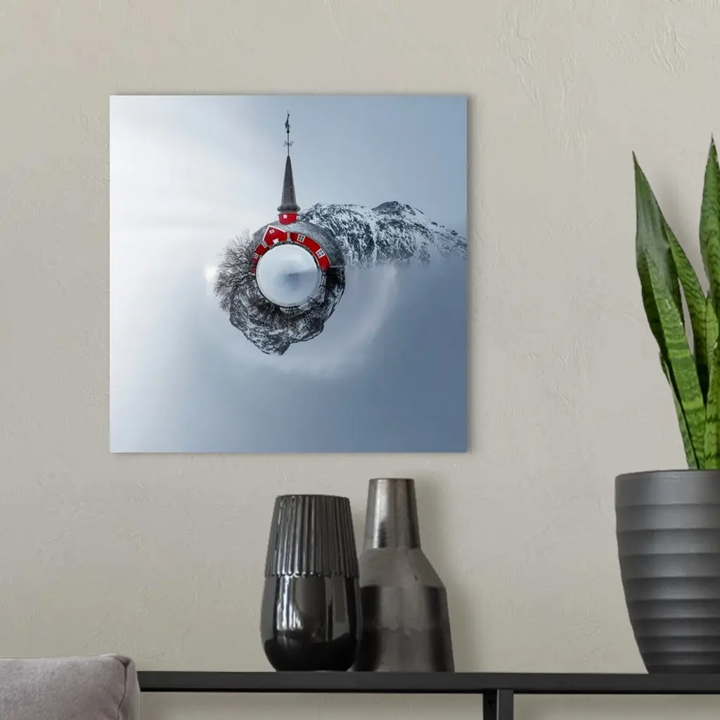 A red church with a tall steeple in the winter, with a stereographic projection effect on the image, resembling a tiny planet.