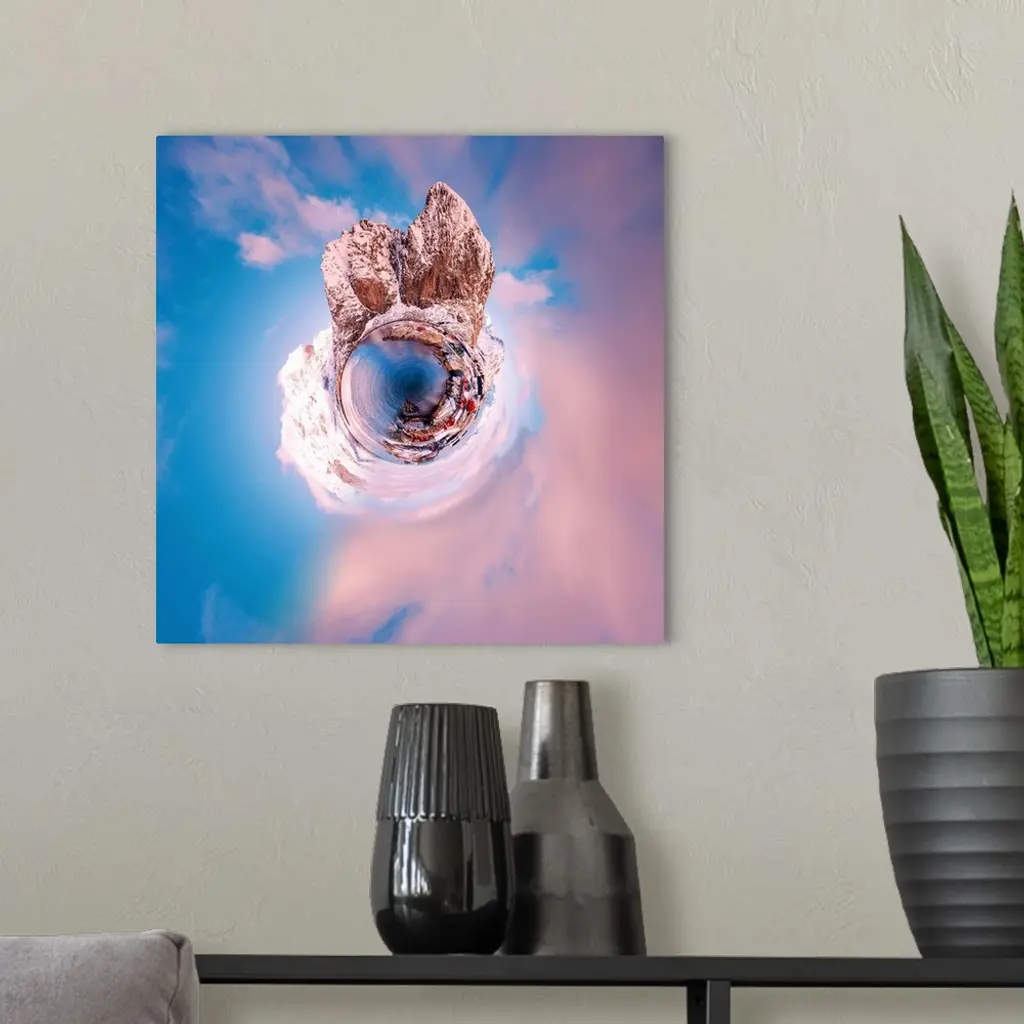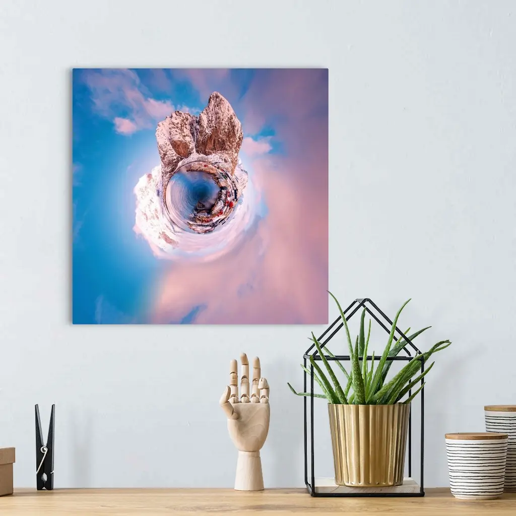 Snow covered mountain peaks at sunset with a pale pink sky, with a stereographic projection effect on the image, resembling a tiny planet.