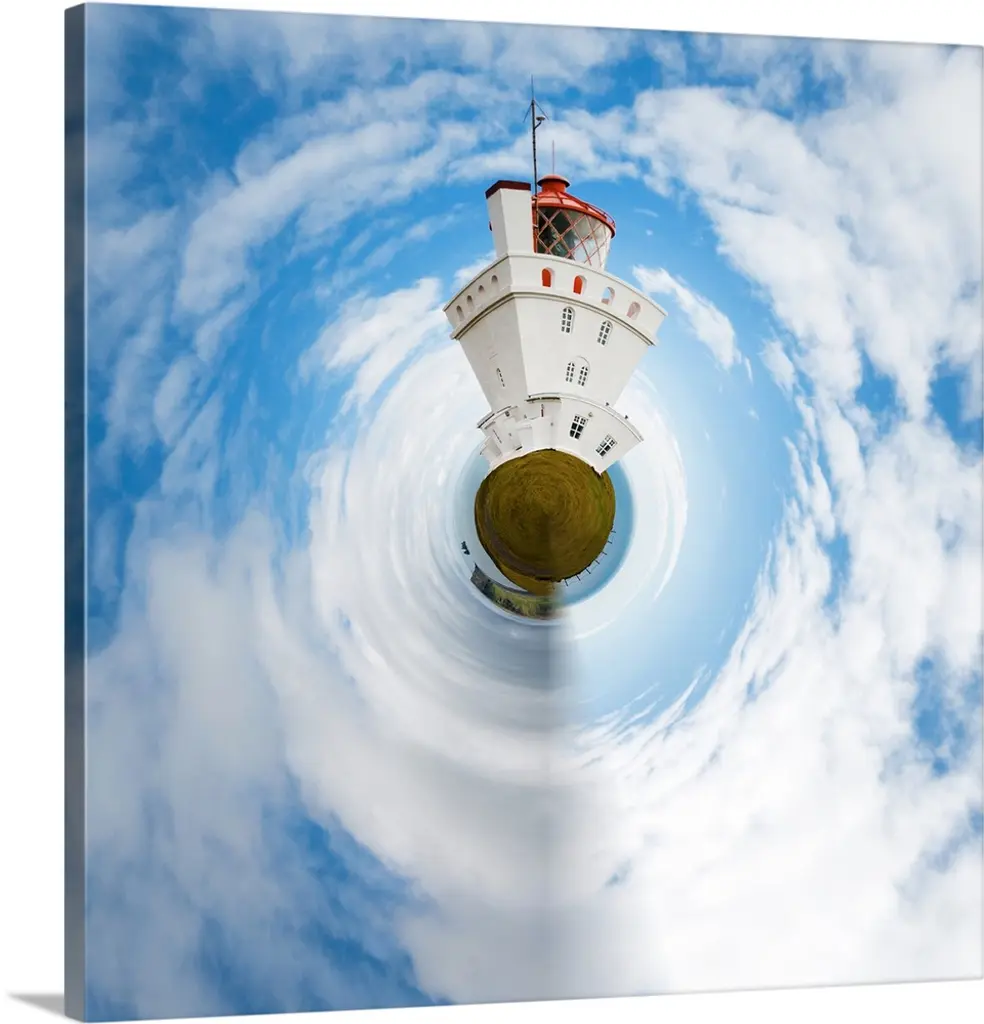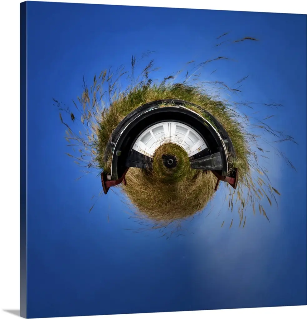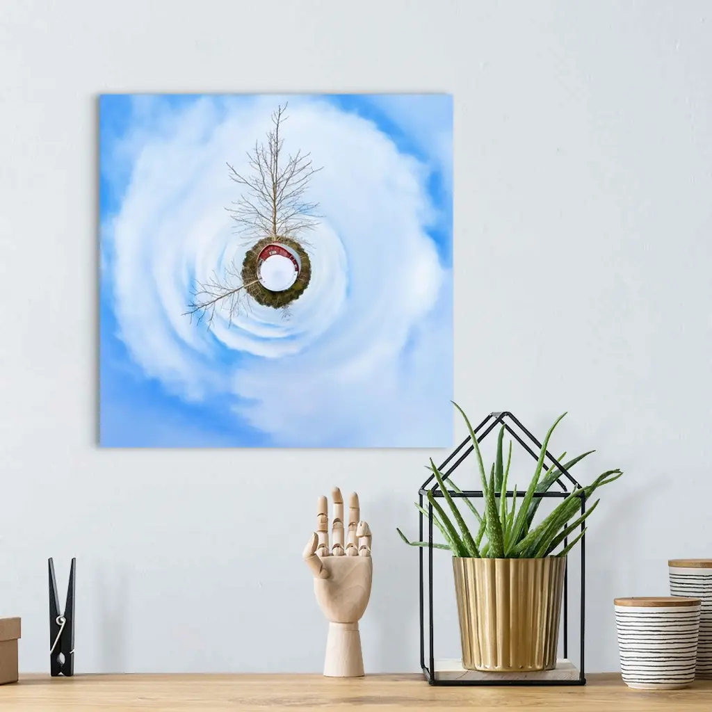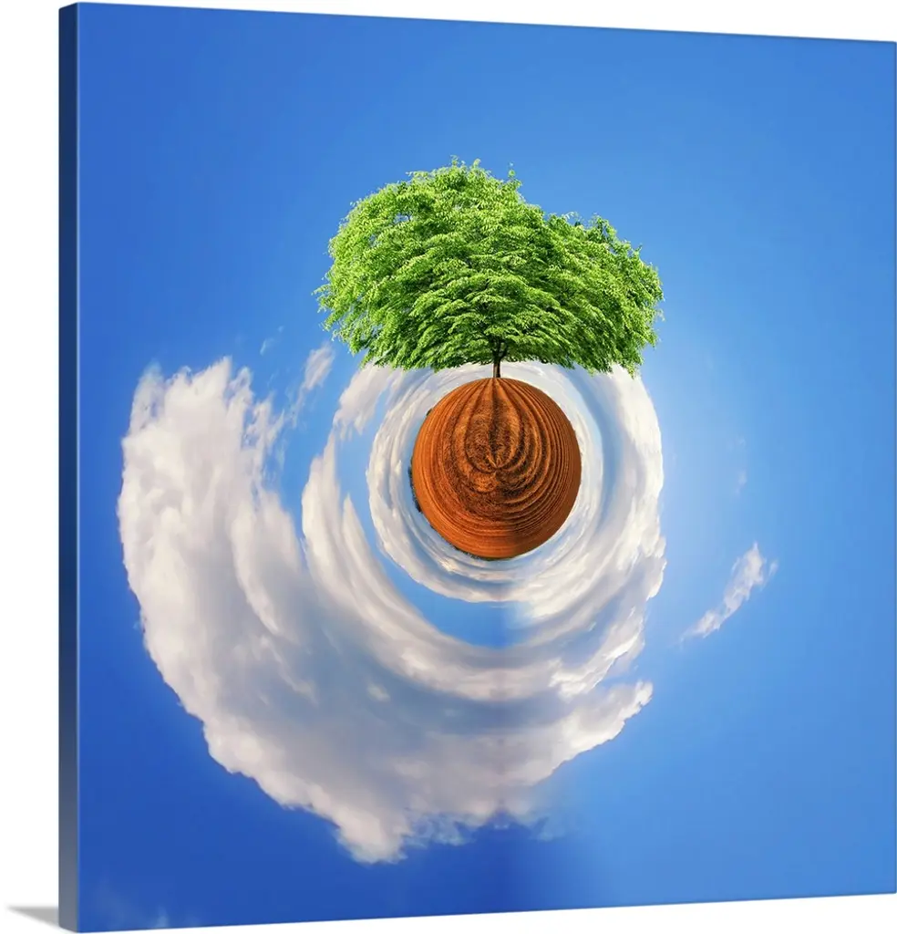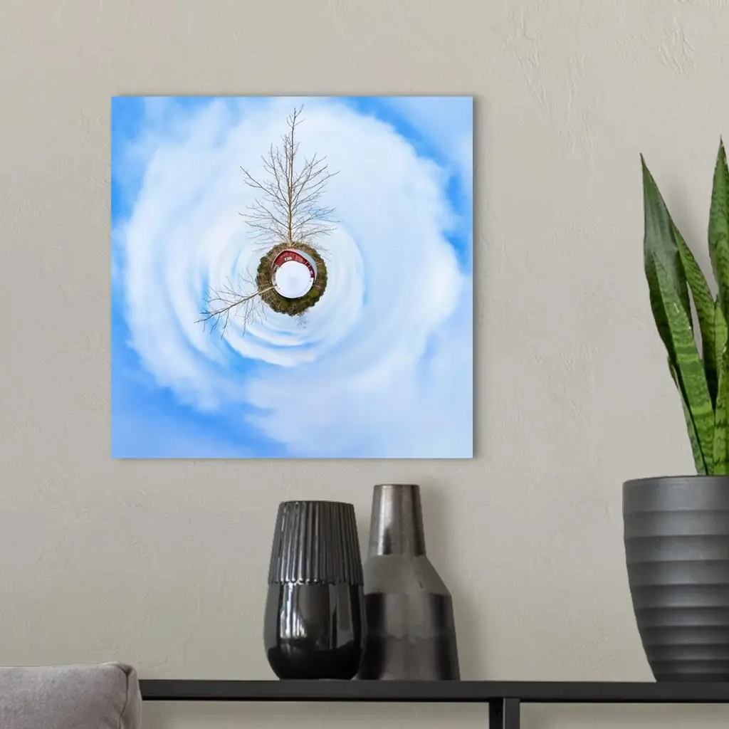 A red barn with two tall trees under a cloudy sky, with a stereographic projection effect on the image, resembling a tiny planet.