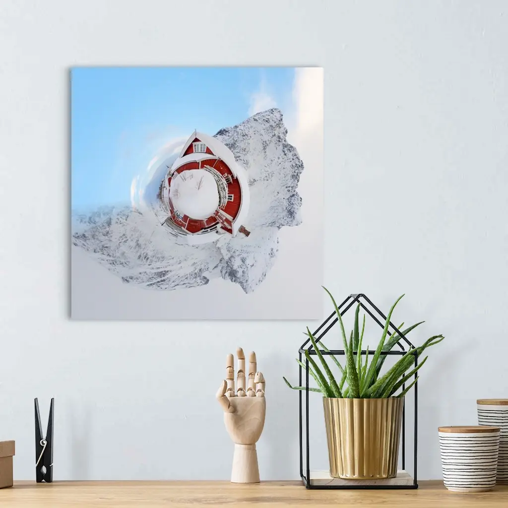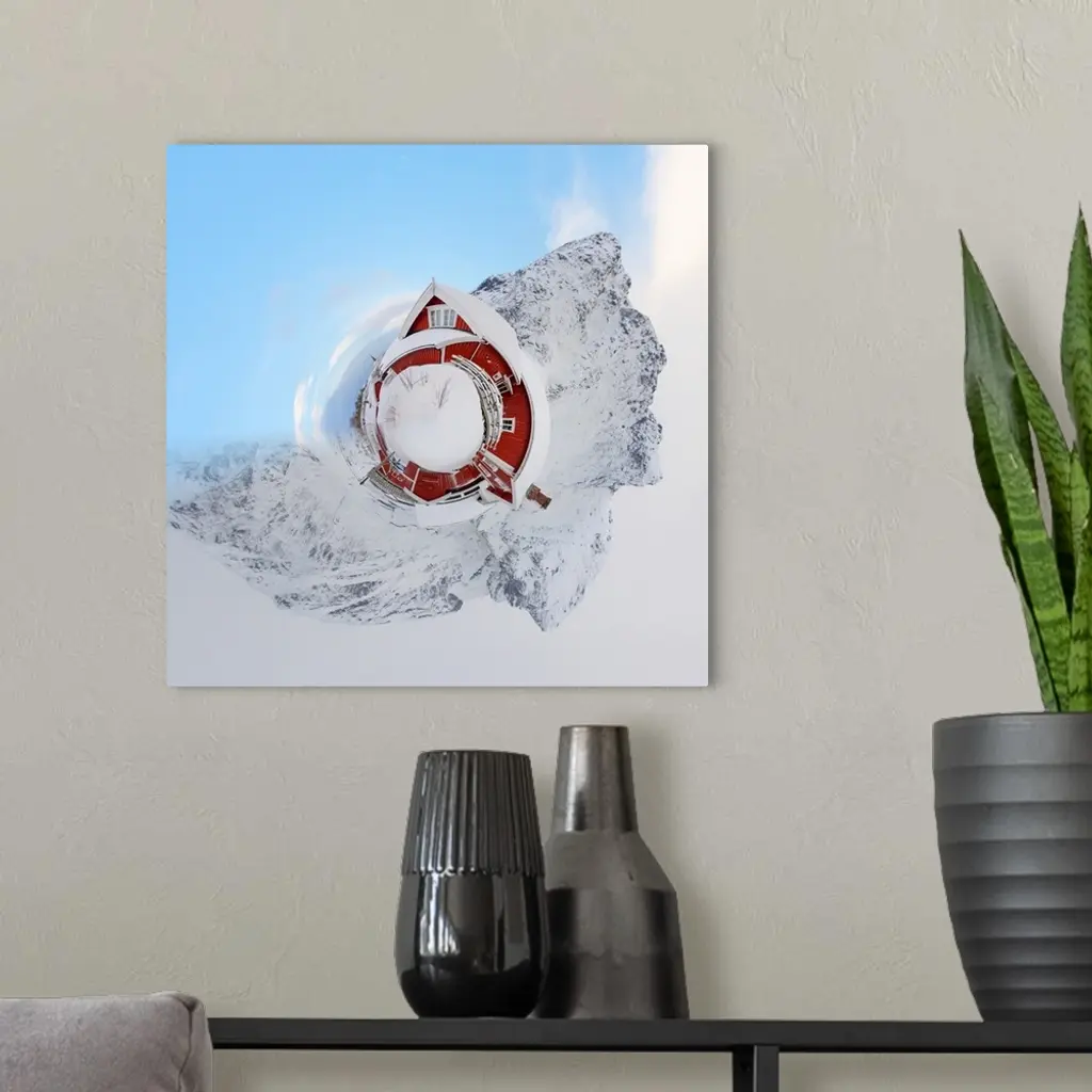 A red barn surrounded by tall mountains in the winter, with a stereographic projection effect on the image, resembling a tiny planet.