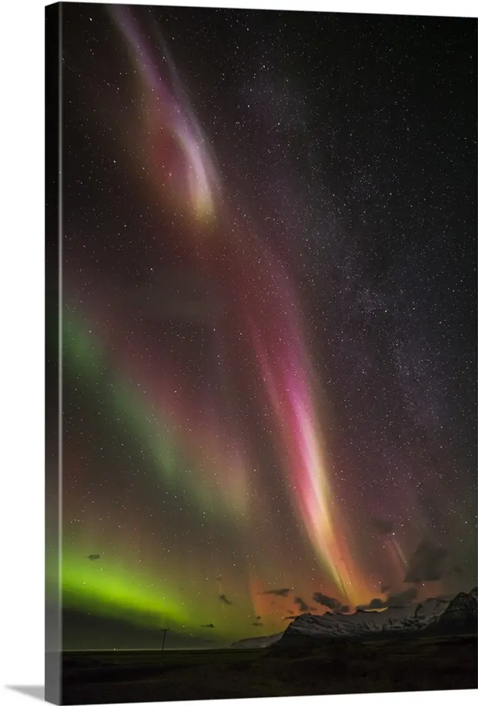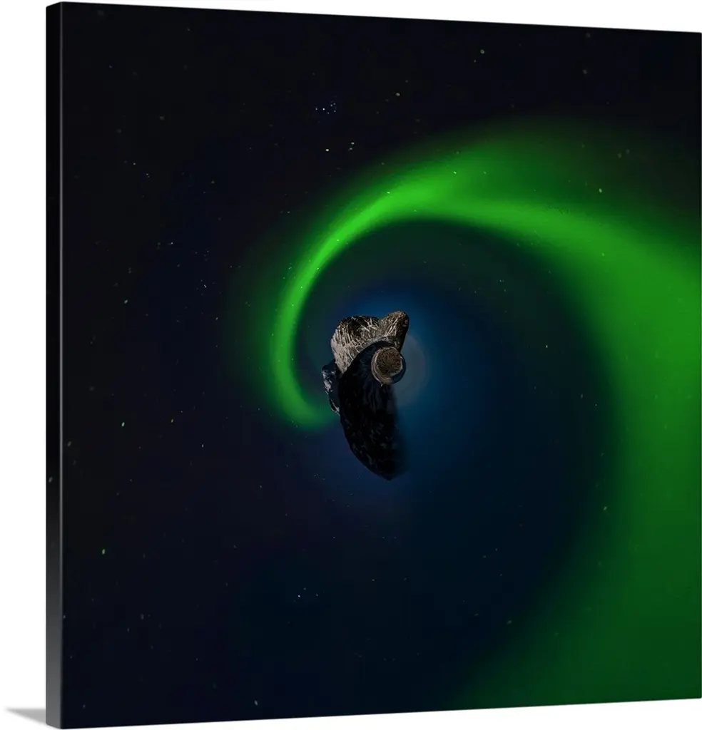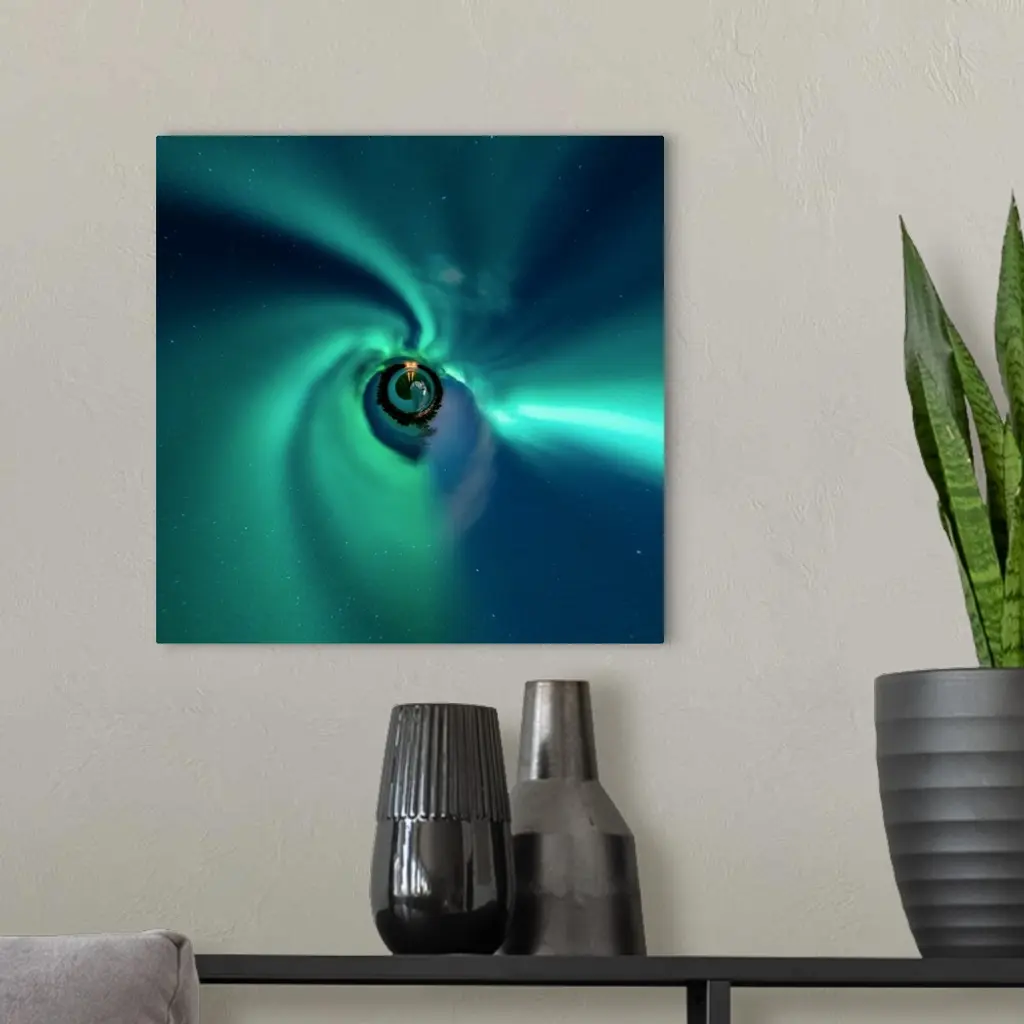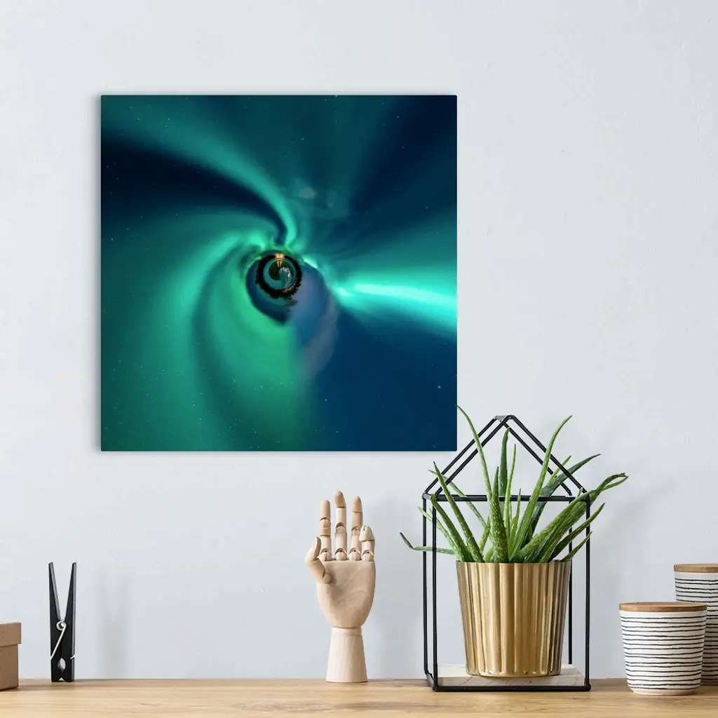 The Northern Lights glowing green at night, with a stereographic projection effect on the image, resembling a tiny planet.