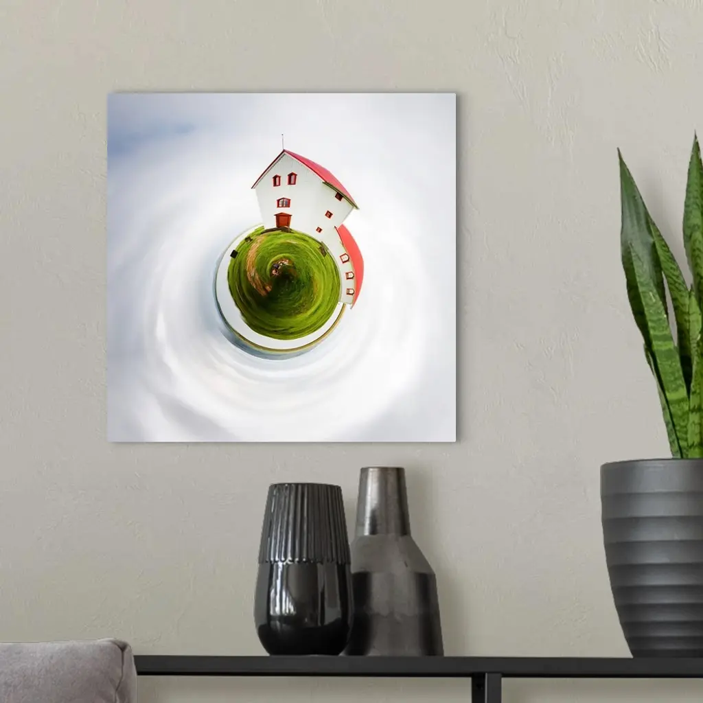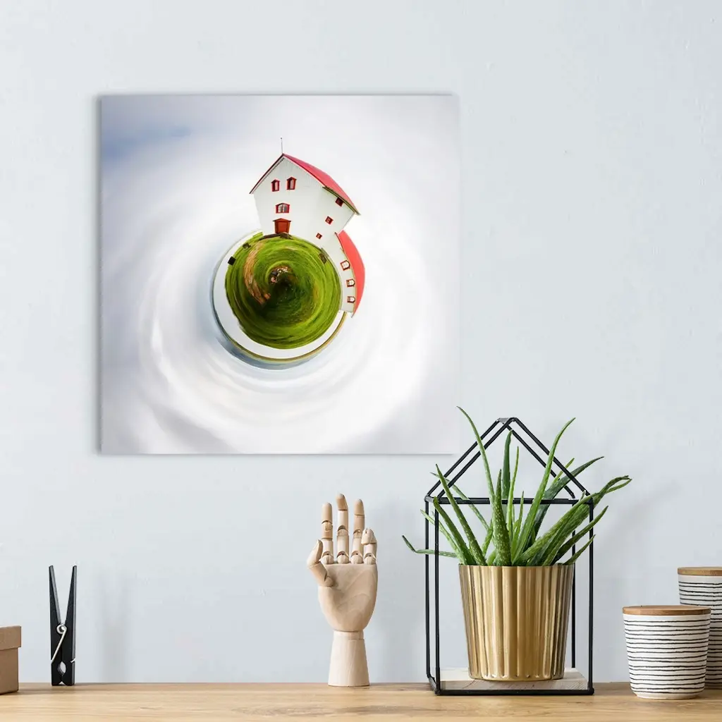 A white house with a red roof on a green lawn, with a stereographic projection effect on the image, resembling a tiny planet.