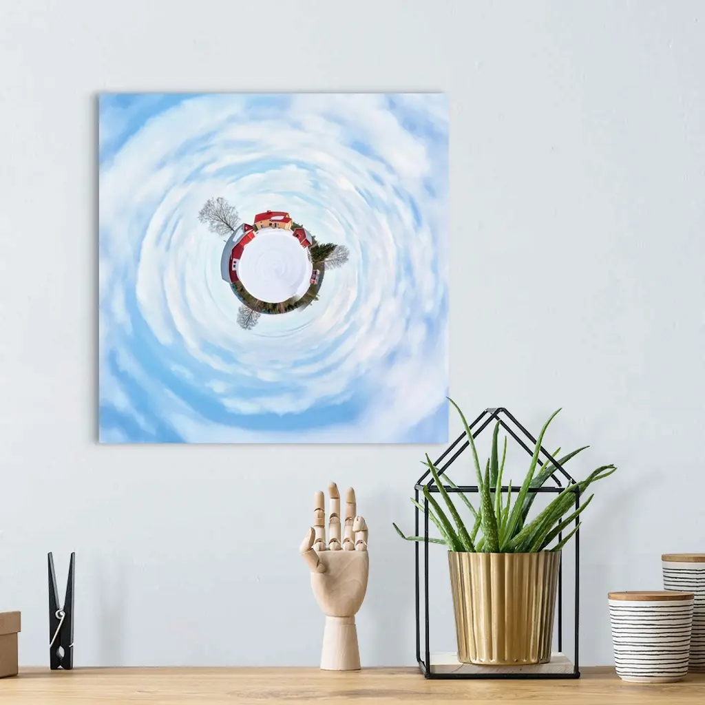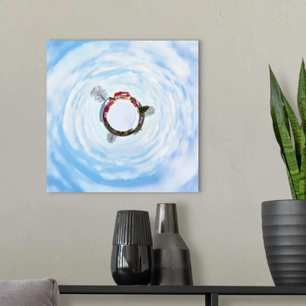 A red barn and farmhouse on a snowy field, under a blue cloudy sky, with a stereographic projection effect on the image, resembling a tiny planet.