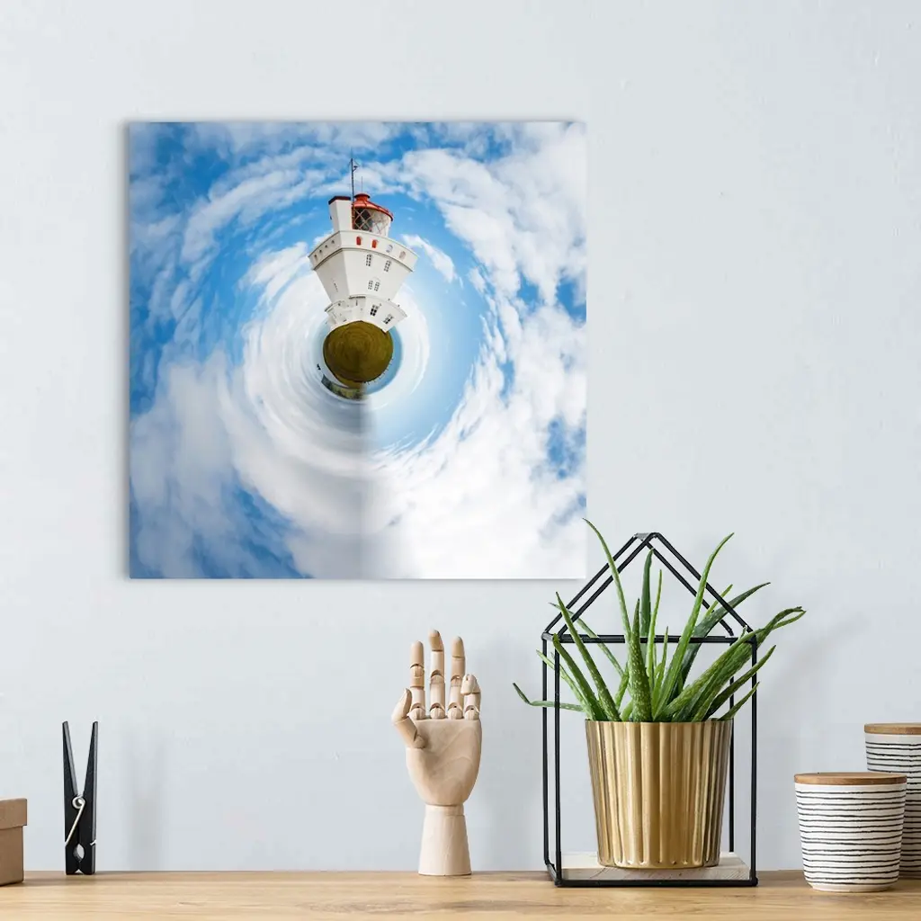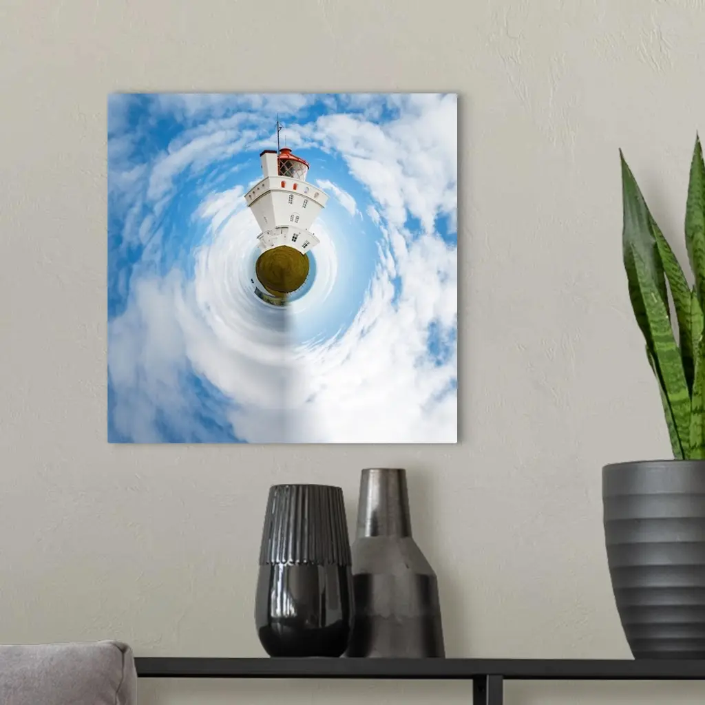 A tall white building rising into the cloudy sky, with a stereographic projection effect on the image, resembling a tiny planet.