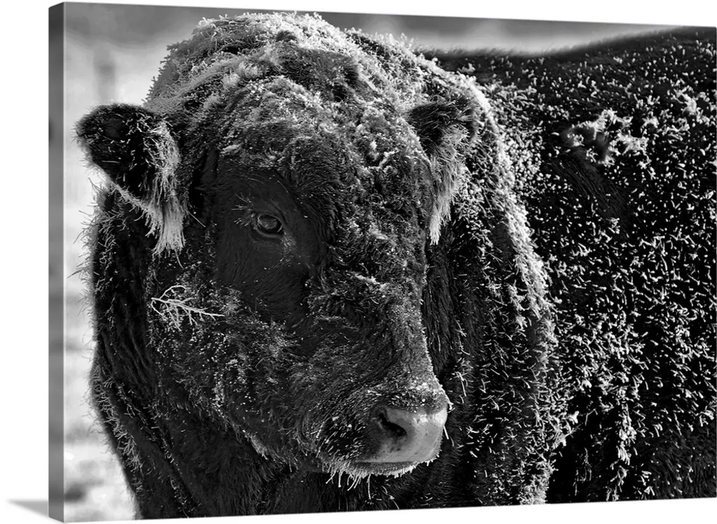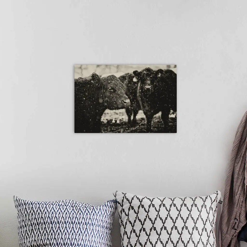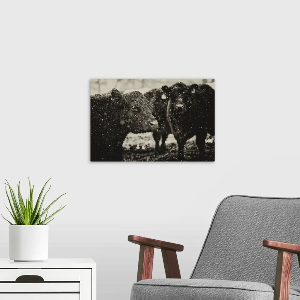 Black and white photograph of a group of cows during a snow fall.