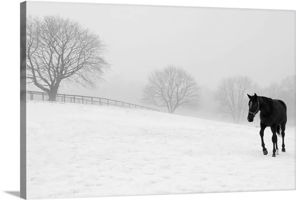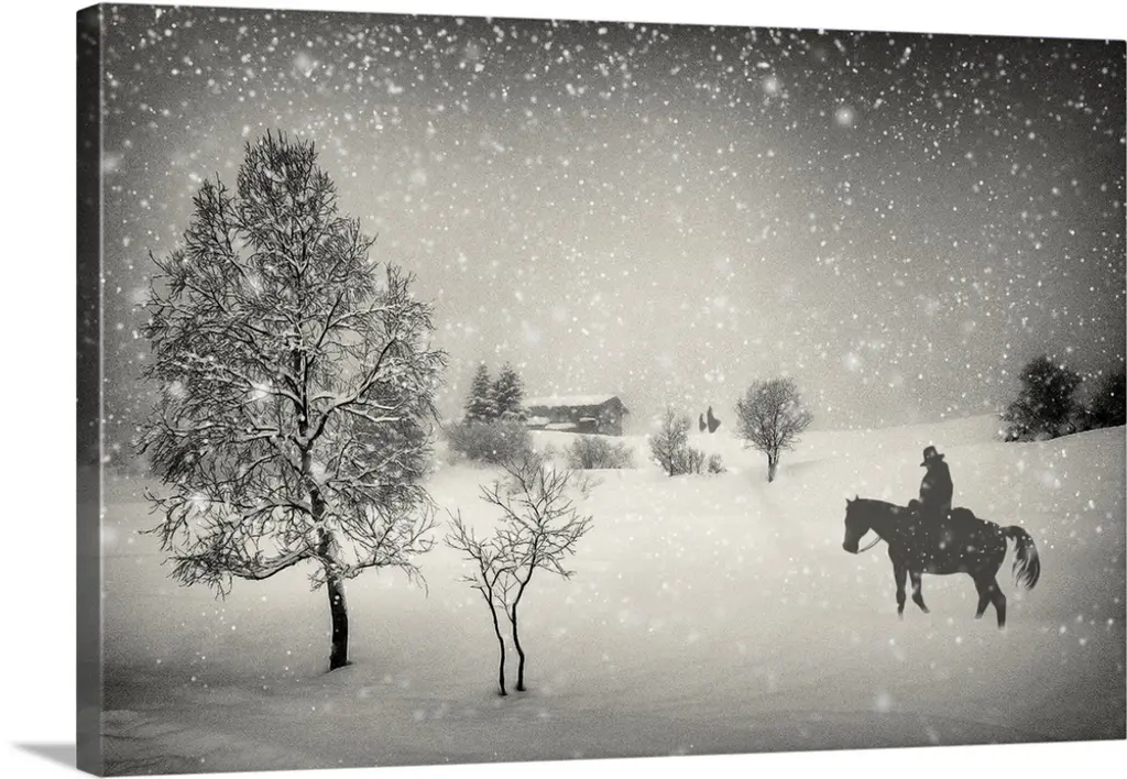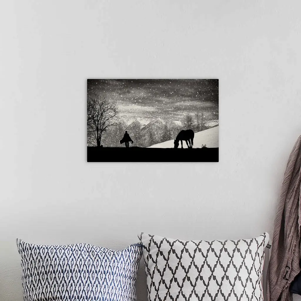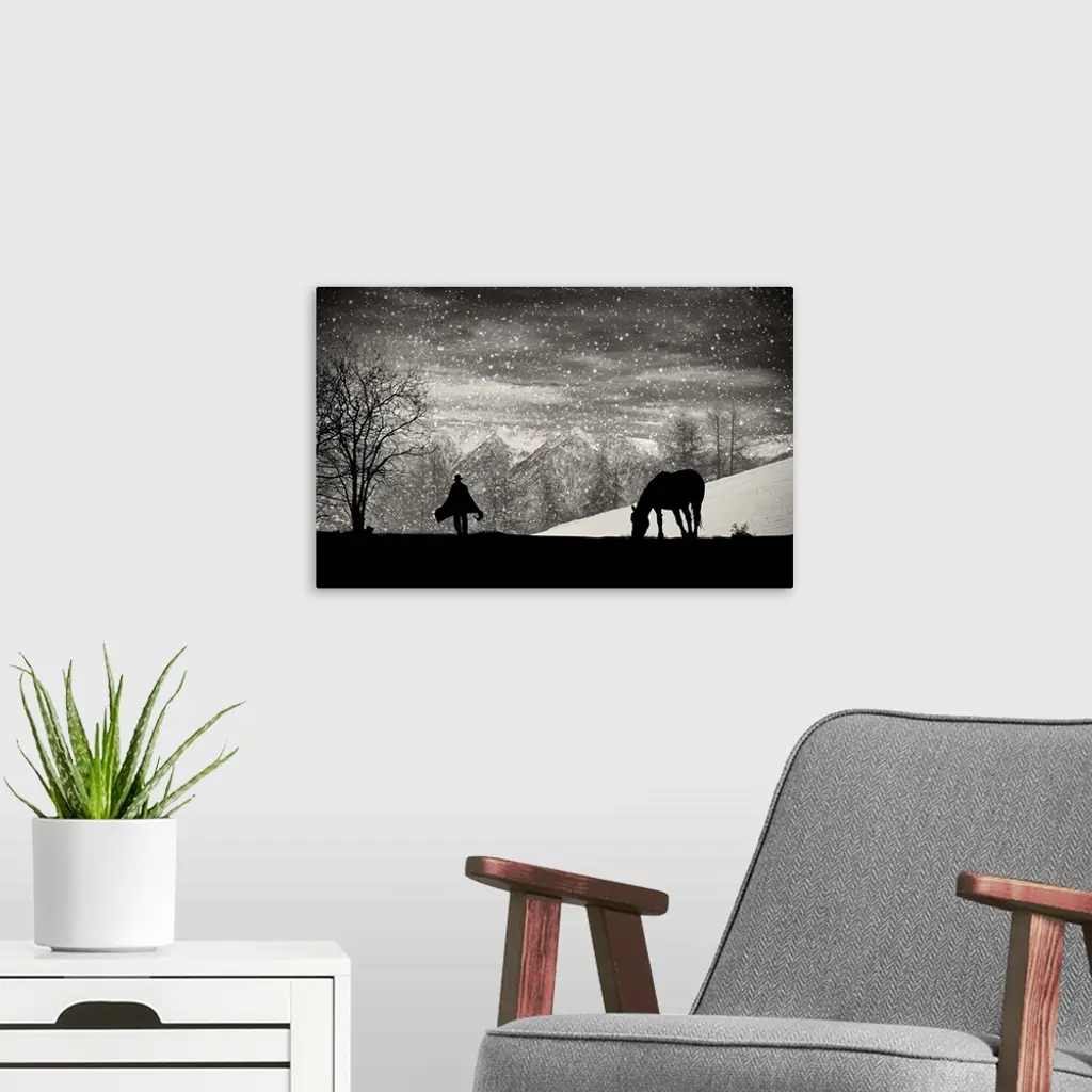 A silhouette of a grazing horse with a figure walking toward it in the falling snow.