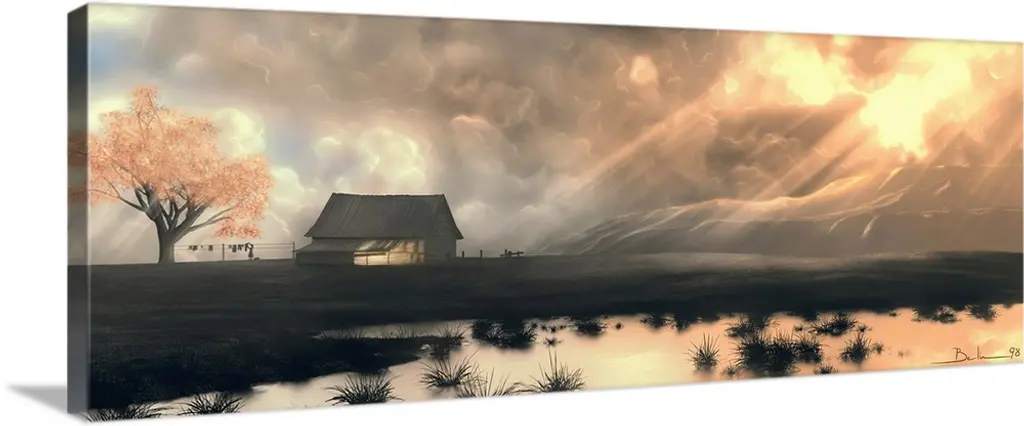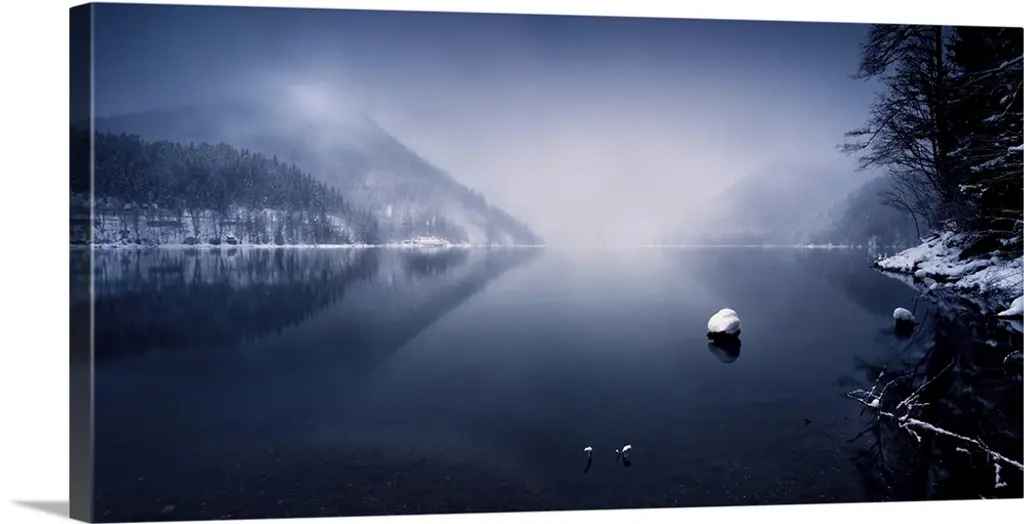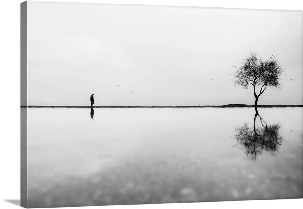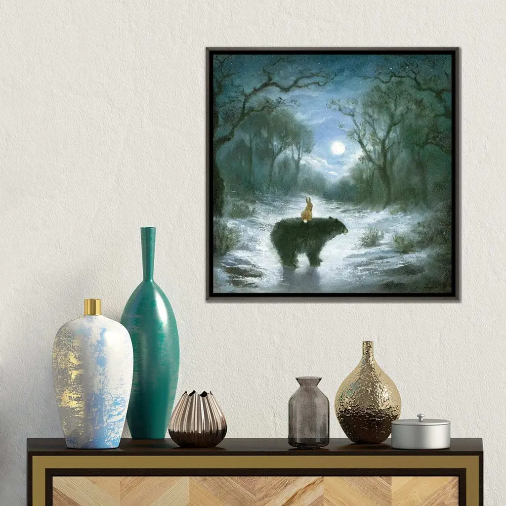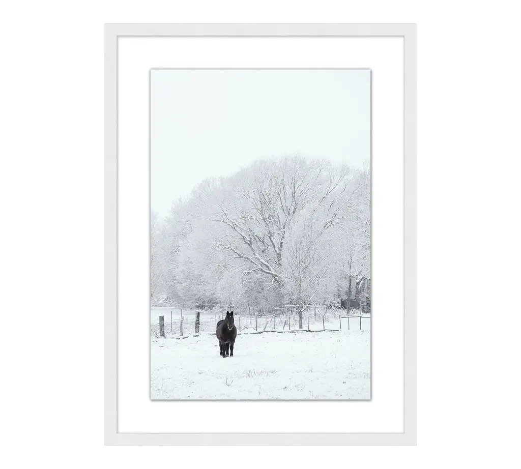 A silhouette of a grazing horse with a figure walking toward it in the falling snow.