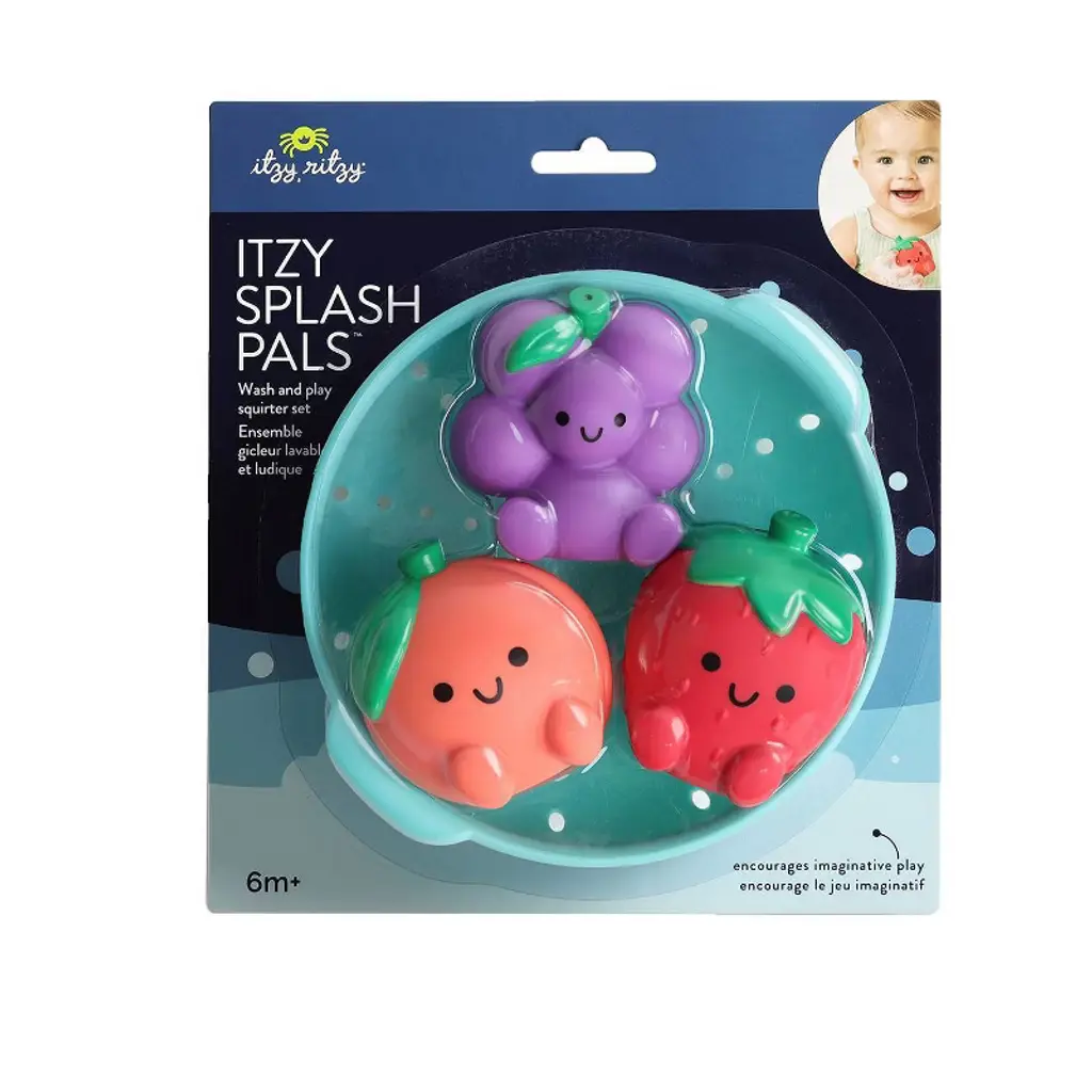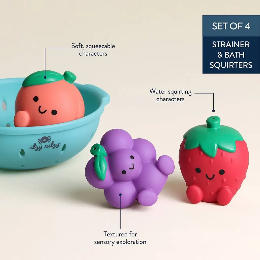 Squeeze in some fun! With Itzy Splash Pals™ bathtime play is overflowing with possibilities! These squeezable fruit-shaped squirties and sprinkle strainer encourage motor skill development and are great for creating endless bath time adventures!
