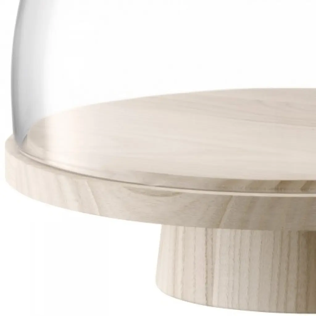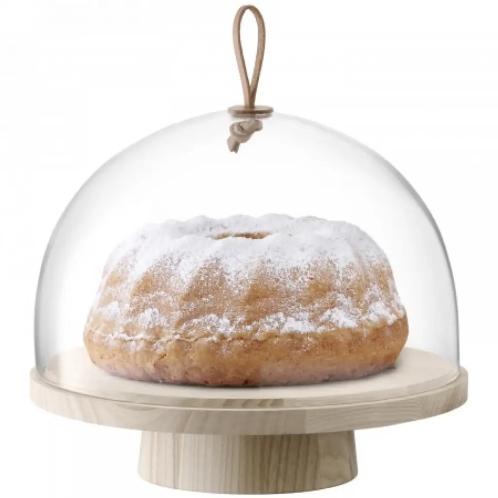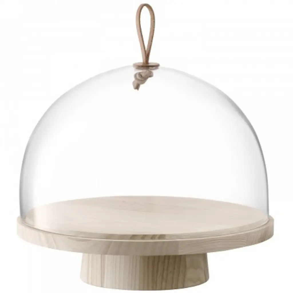 Displaying cheese, pastries, cakes or breads under this wide glass dome from the contemporary Ivalo collection. This handmade dome sits on a natural ash stand, made from sustainably sourced wood, and has a natural leather toggle threaded through the top and knotted by hand. Presented in photographic packaging.