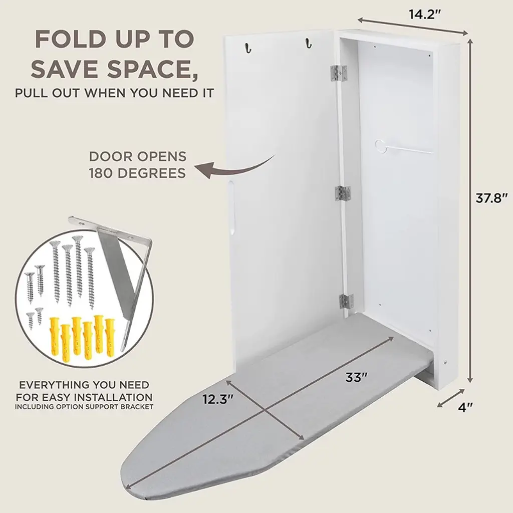 Iron it out, fold it away Few things feel as good as wearing freshly ironed clothing, but setting up your ironing board can be a hassle. Ironing is now easier than ever with the Ivation Wall-Mounted Ironing Board Cabinet. Never struggle to take your ironing board out again. Simply open the cabinet door, unfold the ironing board, and steam away wrinkles from any of your clothing. When you’re done, just fold the ironing board up, close the cabinet, and move on with your day. This cabinet is as tough as it is stylish. The high-quality materials and excellent build quality make this cabinet a sturdy addition to your home. Cleaning is easy with the removable ironing board cover. Start enjoying ironing again with the Ivation Wall-Mounted Ironing Board Cabinet.
