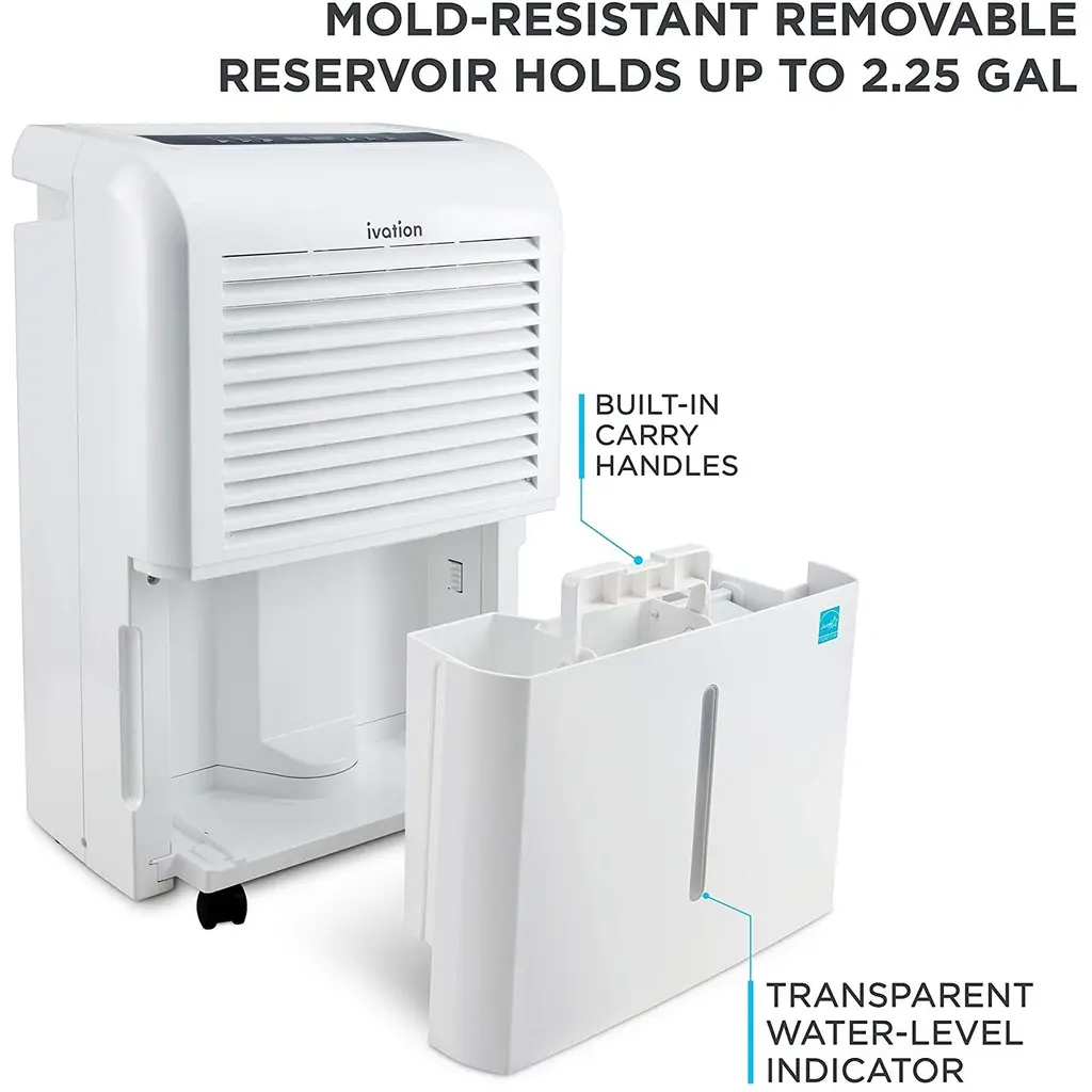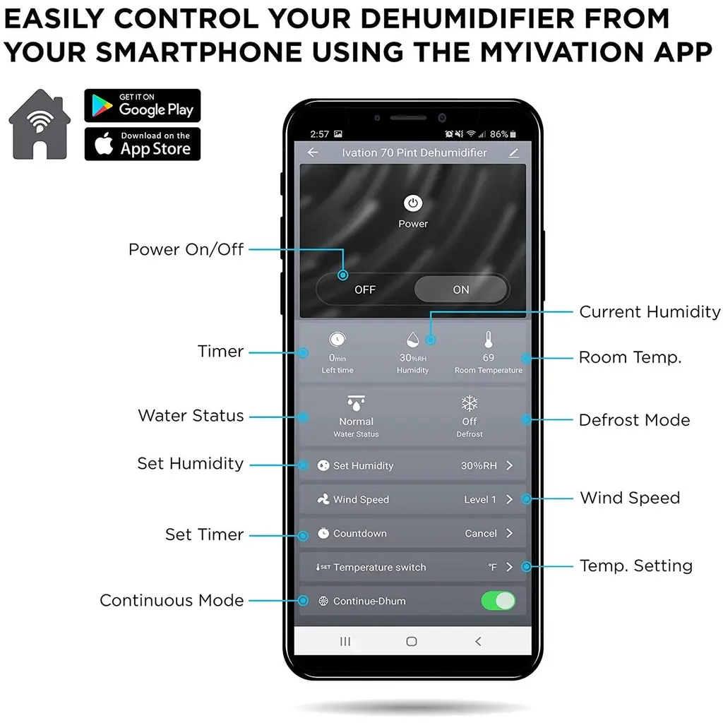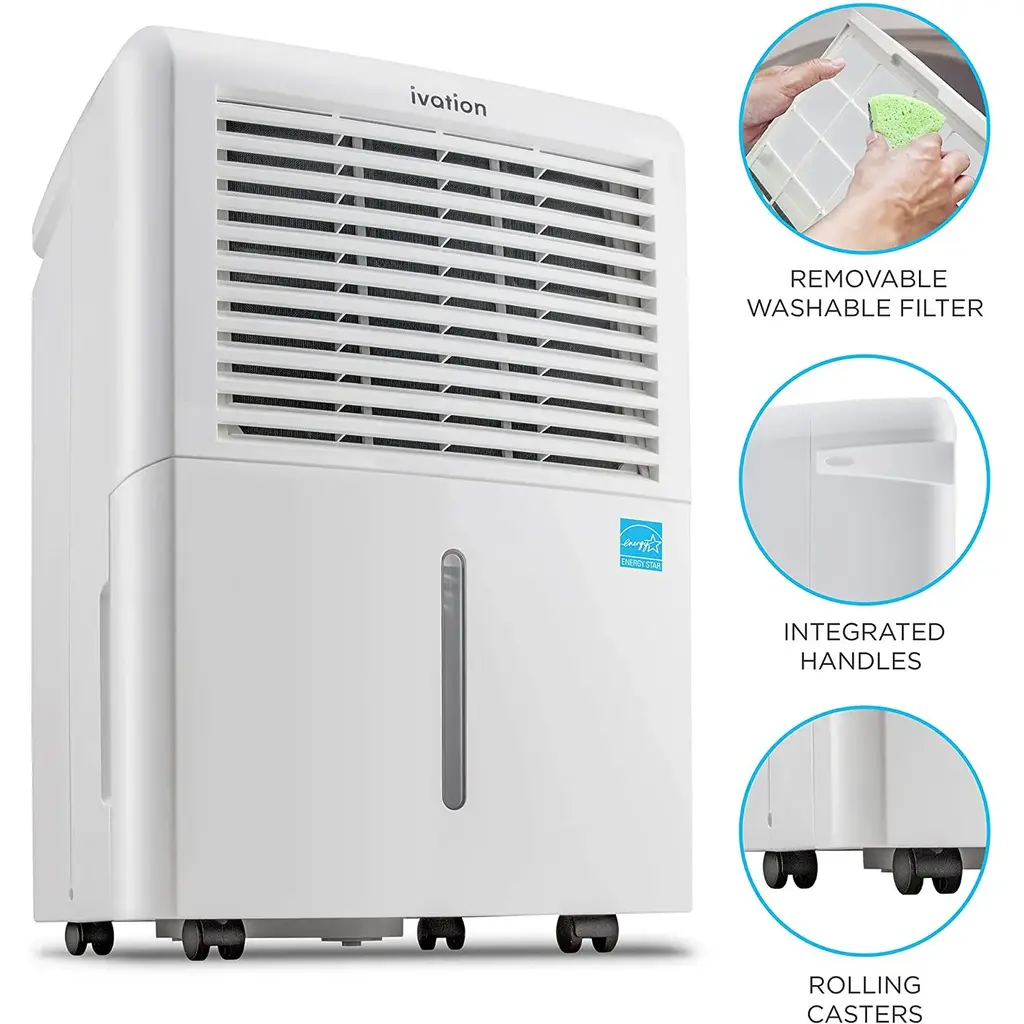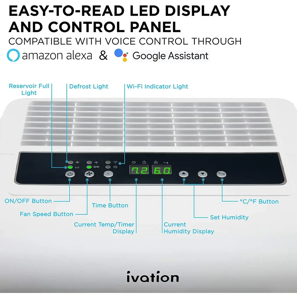 Breathe easy with the Ivation Smart 50 Pint Dehumidifier with Drainage Hose. This high-quality dehumidifier keeps your air fresh and clean by removing up to 50 pints of water from the air per day. Perfect for large areas in your home like the bedroom, living room, or basement, this dehumidifier ensures that dust, mold, and other pollutants are never a concern. With integrated Wi-Fi®, you can conveniently operate your dehumidifier from your smartphone, making it easier than ever to control your indoor environment. The built-in wheels allow for easy mobility from room to room. Plus, you'll never have to worry about the reservoir filling up with water thanks to the included hose for continuous drainage. With a full reservoir alert and auto defrost function, this dehumidifier provides complete control and peace of mind. Say goodbye to stuffy air and enjoy a fresh and comfortable living space with the Ivation Smart 50 Pint Dehumidifier with Drainage Hose.Features: