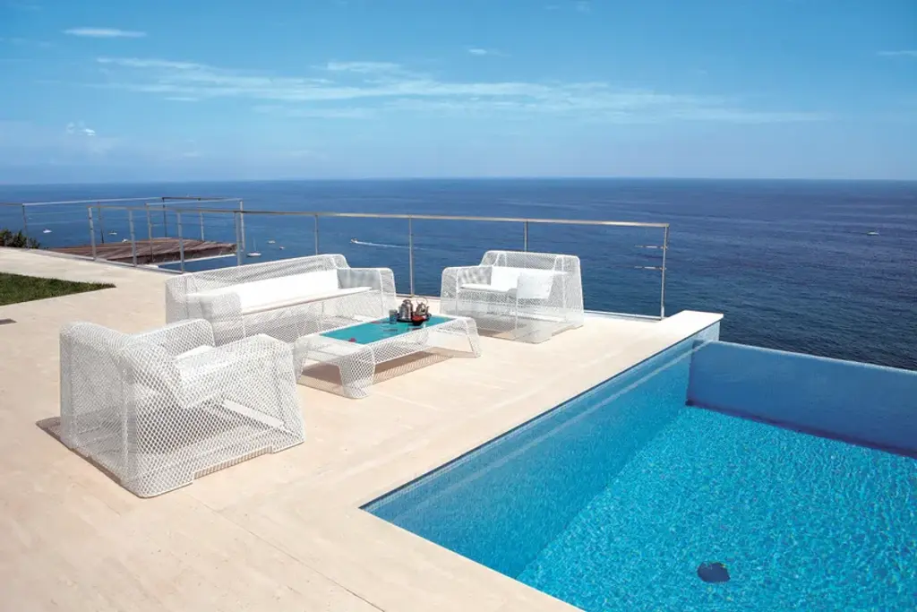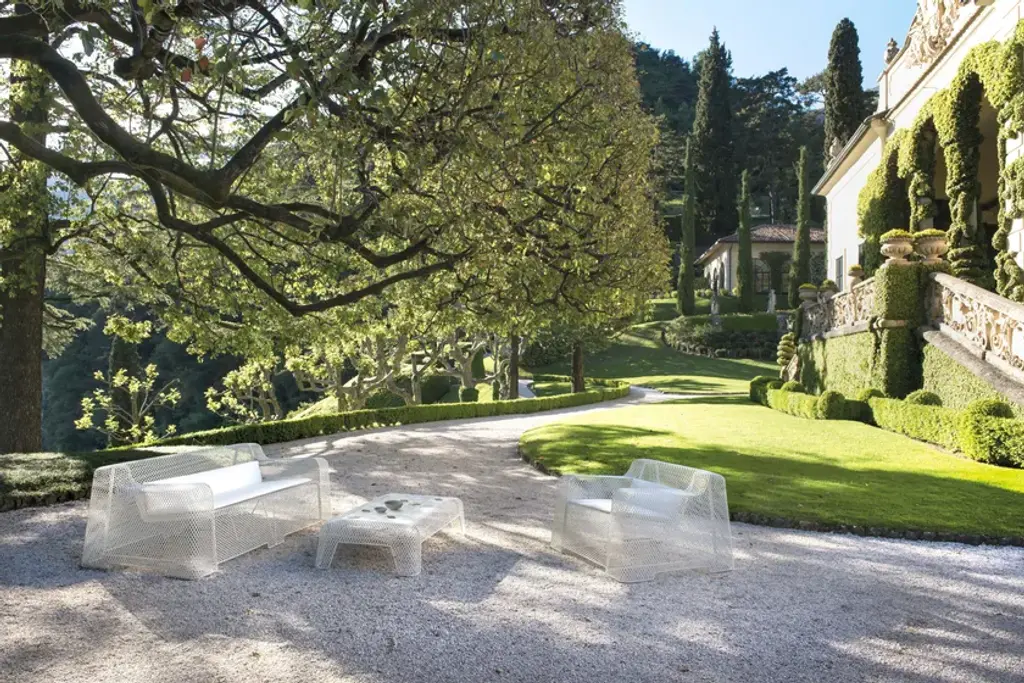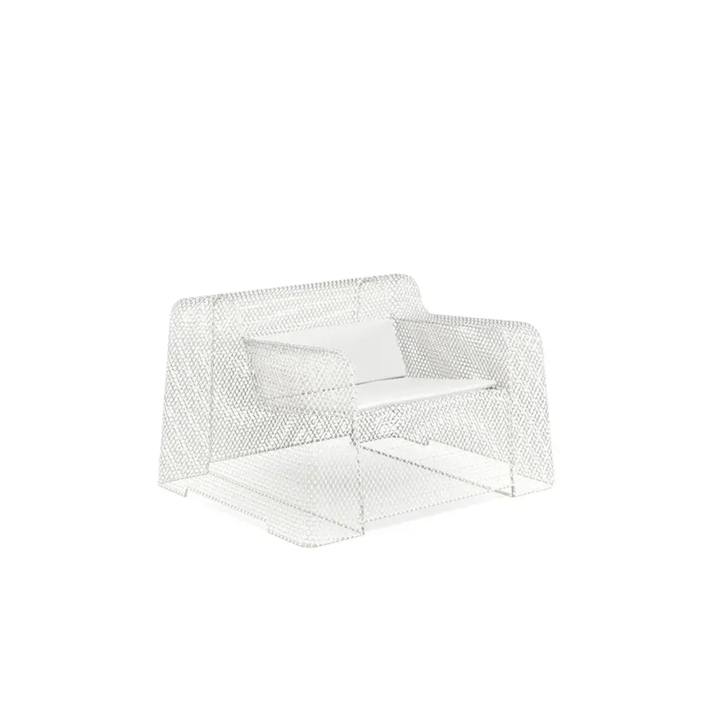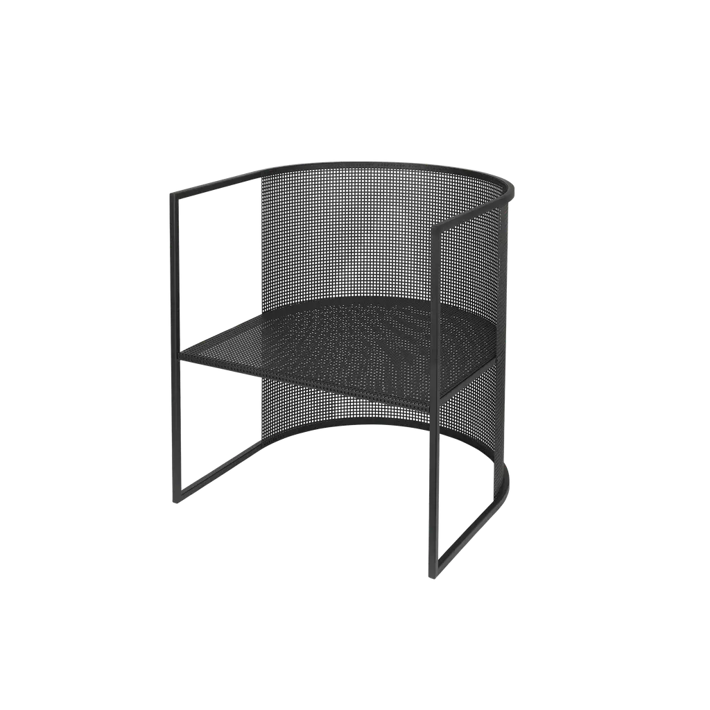 Translating a new outdoor living concept - a steel living area influenced by industrial design - Ivy is a collection of sculptural furniture with straight, formal lines. Soft, sinuous chairs pair up naturally with large dining tables. A defining feature of this collection is the steel mesh sheet interacting with voids and solids, achieving an effect of airy lightness. Imposing hollow forms, which merge with the surrounding nature, harmonise with the interwoven motifs in perfect balance.