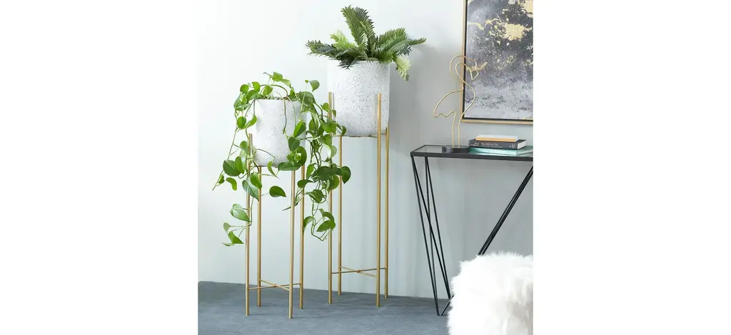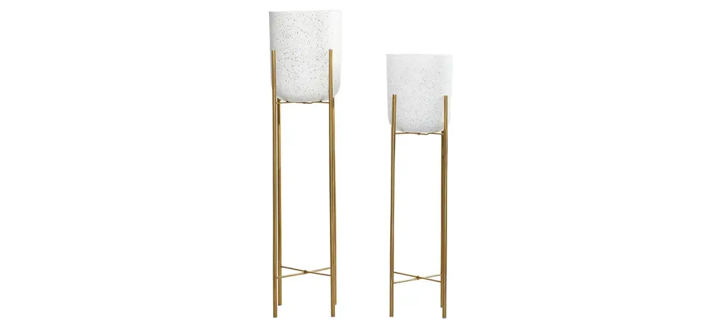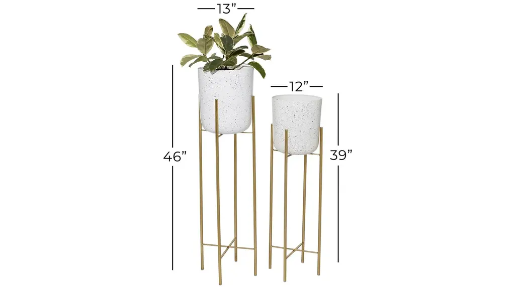 Use the variation in pot size and depth and stand height of this Ivy Collection Gold Metal Planter Set of 2 to furnish contemporary interiors. Completely iron, no-drainage hole pots, and X-shaped bases make up the solid construction for durability. Pots can be used as planters or as accent pieces together or separately. Features rubber stoppers beneath each foot to prevent scuffing and sliding. Wipe clean with a dry cloth. Suitable for indoor and outdoor use. No drainage holes.