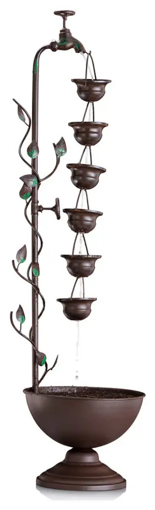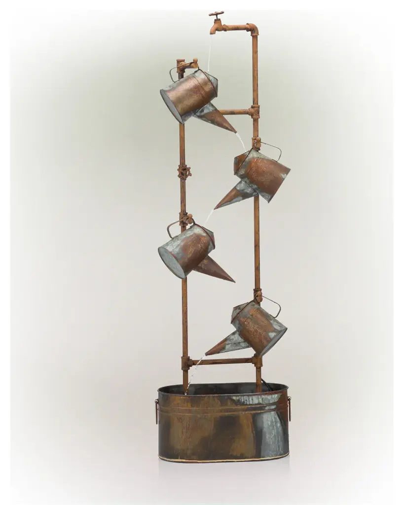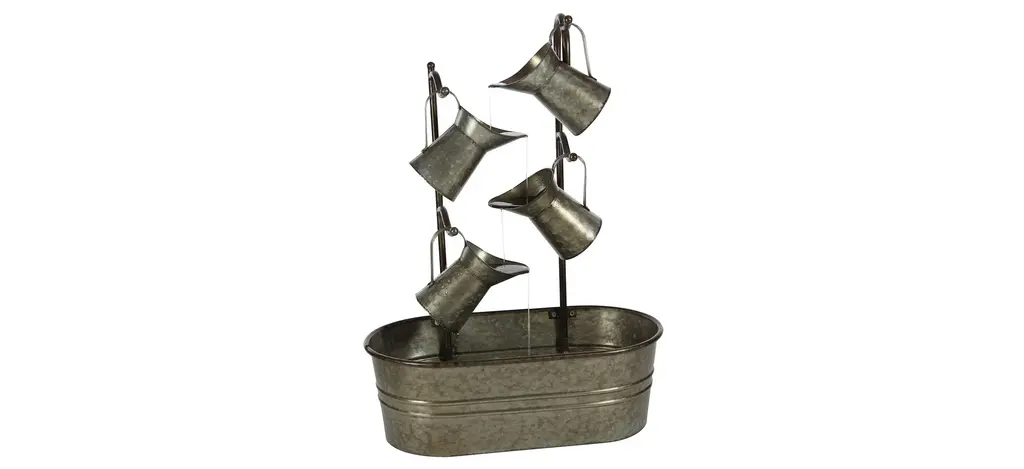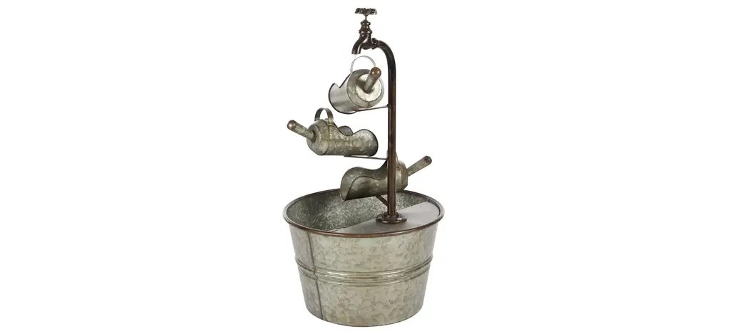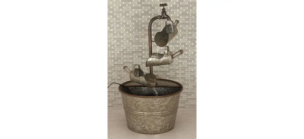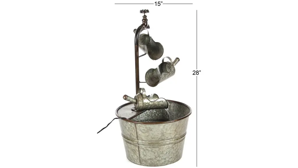 This Ivy Collection Gray Metal Fountain is an accent piece that brings tranquility to your space by allowing water to pour smoothly, imitating the sound of a flowing river-promoting wellness and creating an immediate feeling of relaxation. Beautifully detailed, it features round basin reservoir, water tubing, faucet, and scooper-inspired deck. This fountain is made out of metal with solid construction, offering durability and stability. Wipe clean with a dry cloth. Includes faucet with wheel handles. Suitable for indoor and outdoor use. Some assembly required.