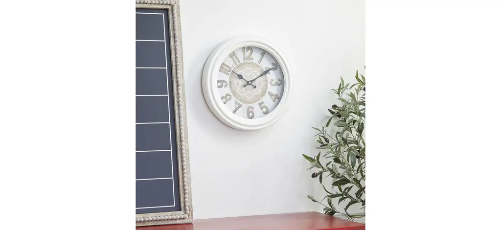 This Ivy Collection Gwilidor Wall Clock features a clean white frame and outer clock face. The inner part of the clock face features an elaborate mandala figure with the minute markers on the edges of it. This wall clock will make heads turn towards any wall in your boho inspired home with the laid back, soothing, and relaxing vibes it carries with it. 1 AA battery required (not included). Arabic numerals for the hour markers. The clock mechanism runs silent. Metal secure loop backing for easy hang.
