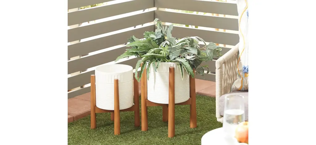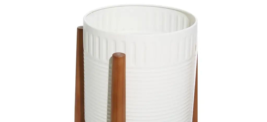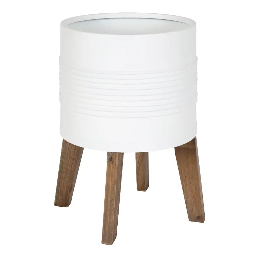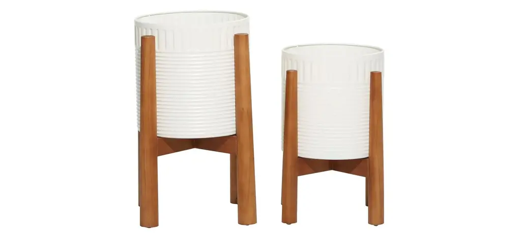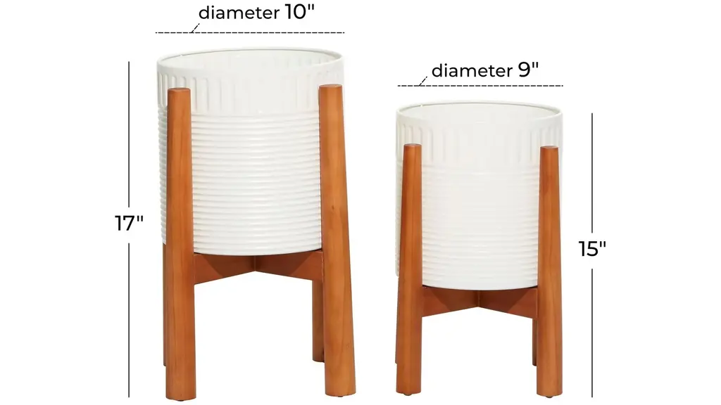 If you feel like your boho space is lacking an essential ingredient, this Ivy Collection Lahijani Planter Set of 2 will bring you a step closer. This wood and metal design features a round metal plant container with a corrugated pattern on the body and rim. The metal part comes in a white finish. The planter stands elevated on 4 wooden legs for its stability and for better water and air circulation for your plants. This will definitely inspire you to add some greenery in your boho inspired living room, dining room, home office or entry way. Suitable for indoor and outdoor use. No drainage holes.