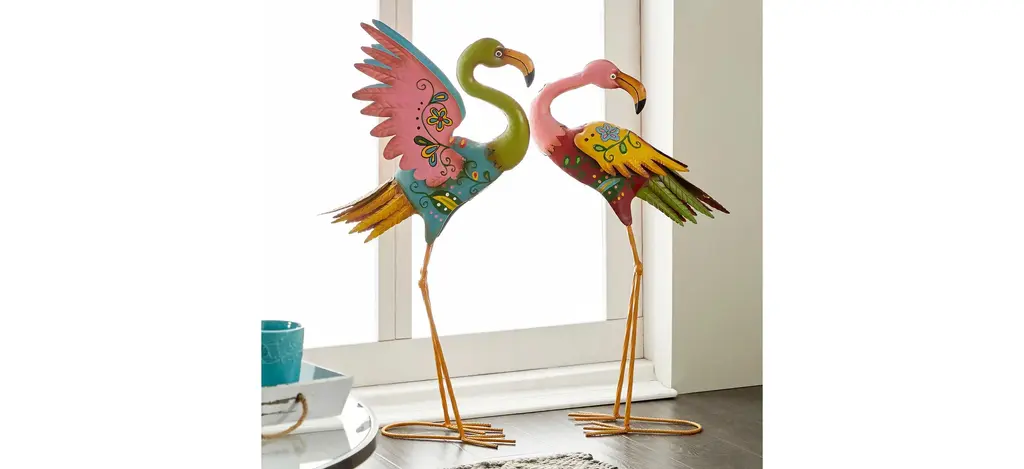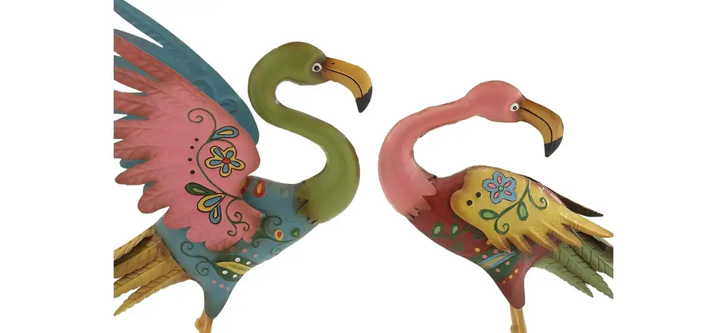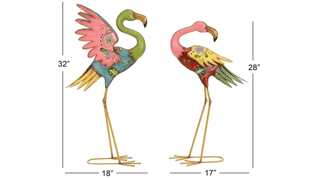 Elevate the decoration of your home with the help of the Ivy Collection Multi Colored Metal Garden Sculpture Set of 2. These figurines are bound to impress your guests with their marvelous design and uniqueness. Accent pieces made of iron, these garden figurines come with impressive painted floral pattern and multi-color finishing. Each one is designed with detailed characteristics and metal feet that serve as a sturdy base. This set of flamingo garden sculptures will absolutely add an artistic twist to indoor or outdoor spaces. Wipe clean with a dry cloth.