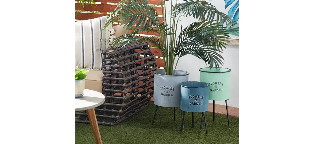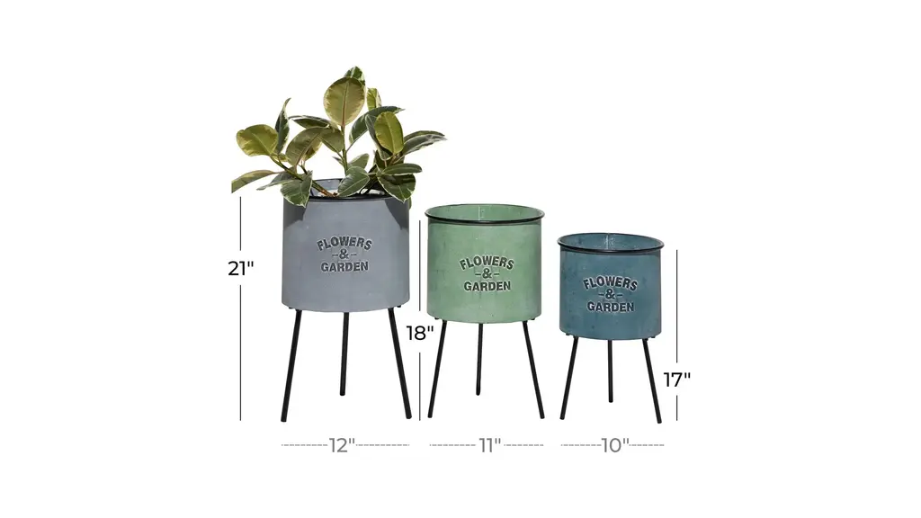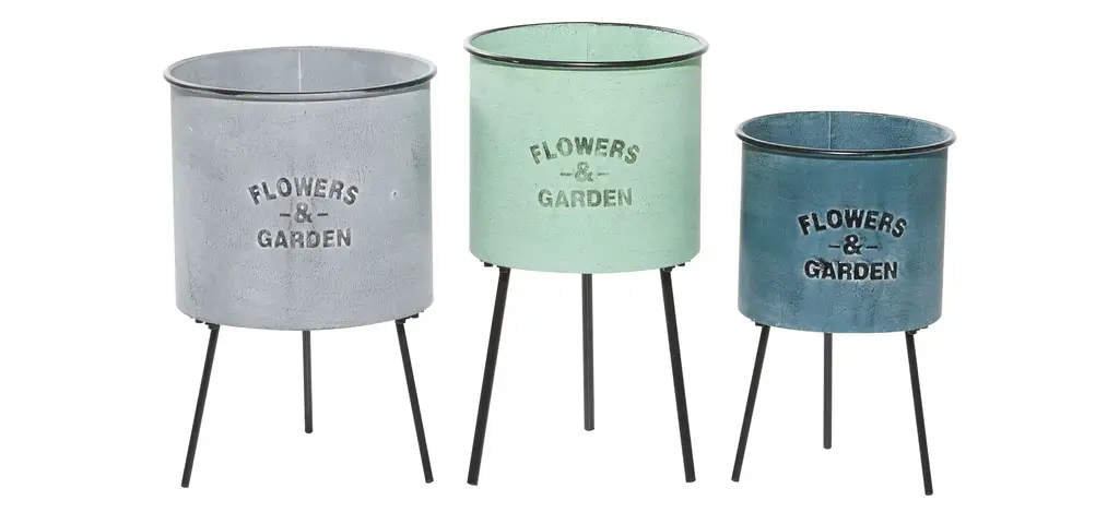 Use the Ivy Collection Multi Colored Metal Planter Set of 3 as plant holders or corner accent pieces in modern or contemporary interiors. Wipe clean with a dry cloth. Suitable for indoor and outdoor use. Pots do not have drainage holes. Each planter showcases "Flowers & Gardens" typography.