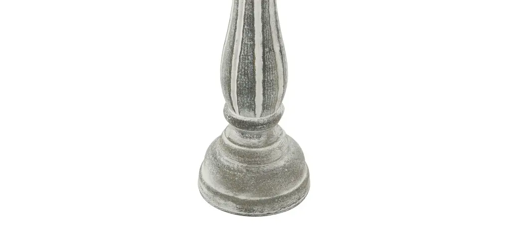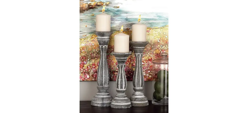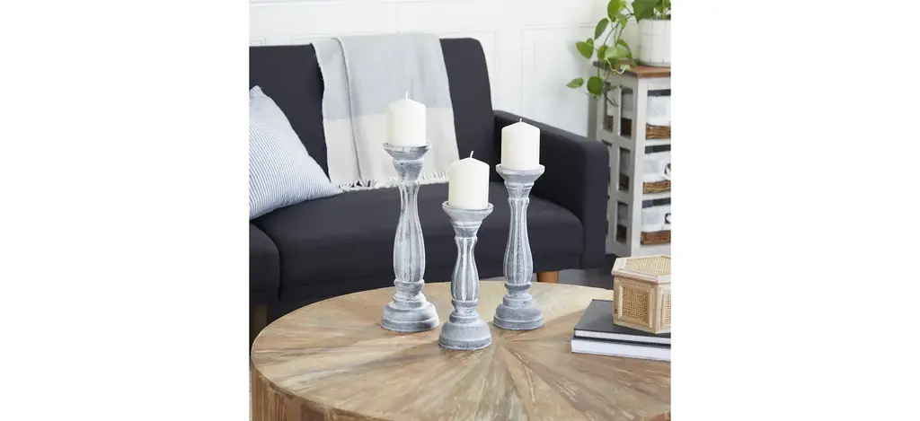 This Ivy Collection Set of 3 White Wood Candle Holders is the finishing touch you are looking for in your cottage chic interiors. The architectural column-like silhouettes and carved ridges were crafted from dark pinewood and then given a distressed neutral hue. Use them as dim light holders in the dining area or as centerpieces on top of dressers and side tables. Designed with black rubber stoppers at the base that prevent scratching furniture and table tops, as well as sliding around. Each pillar candle holder can accommodate one votive or pillar candle. Suitable for indoor use only. This set includes 3 candle holders.
