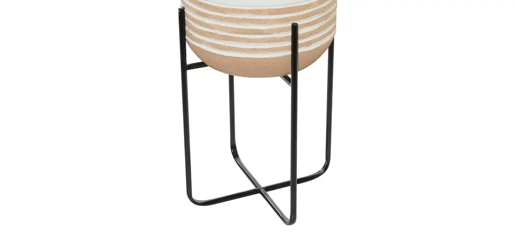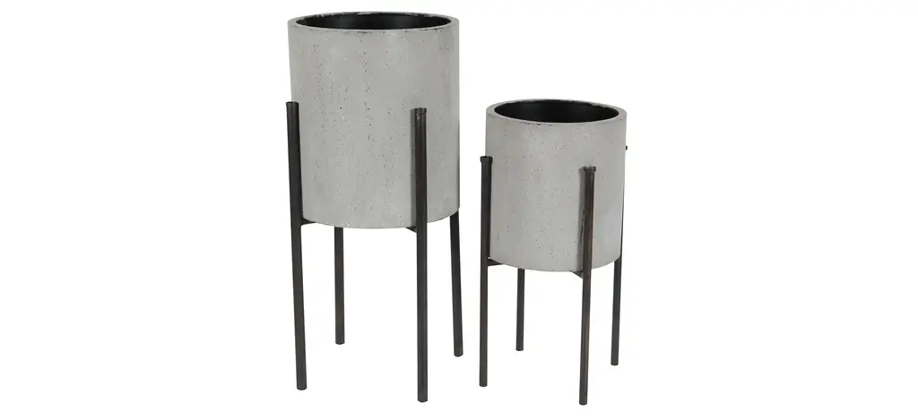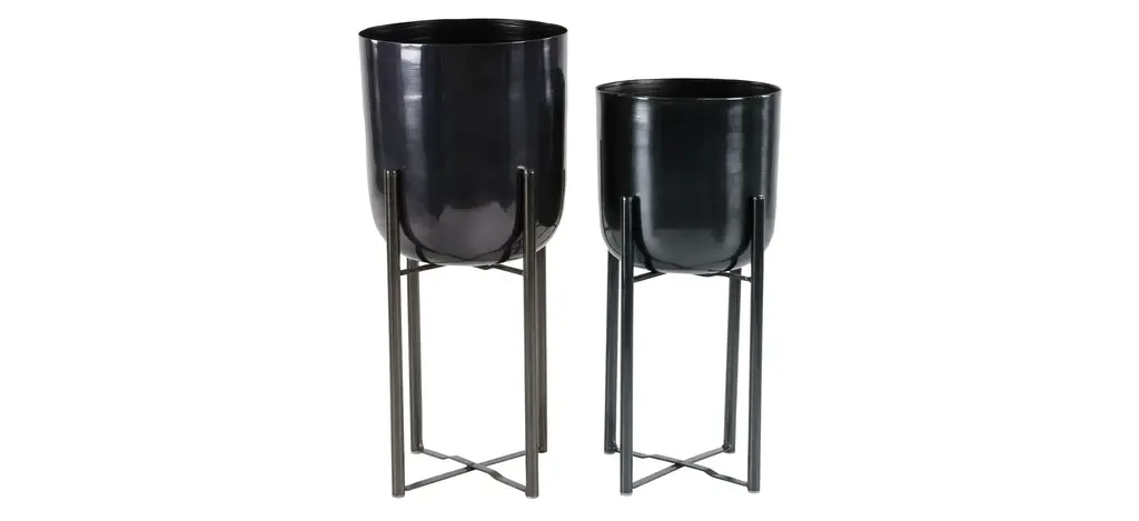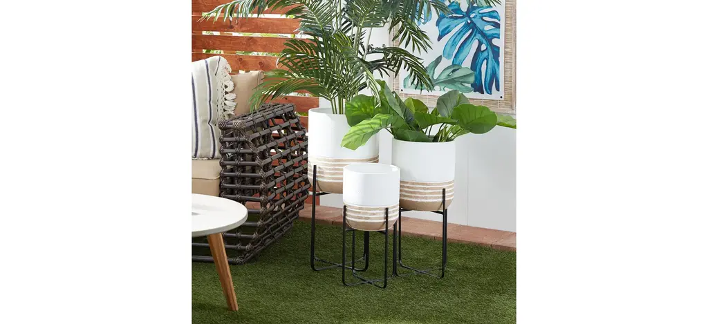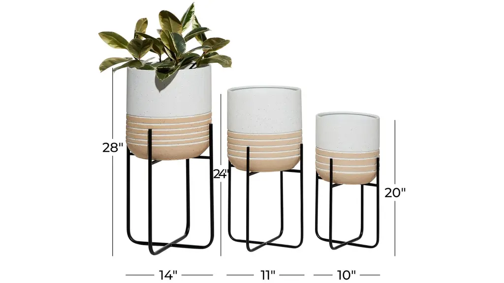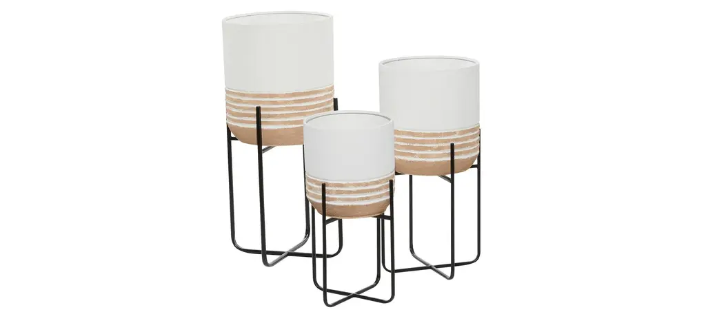 The Ivy Collection White Metal Planter Set of 3 can complement almost any color palette, pattern, and texture in your space. The solid construction of both X-based stands and no-drainage hole pots are made of iron to add pizzazz to a corner of your living space. Planter heights are 20", 24", and 28". Use as plant holders or corner accent pieces in art deco or contemporary interiors. Suitable for indoor and outdoor use. Pots have no drainage holes.