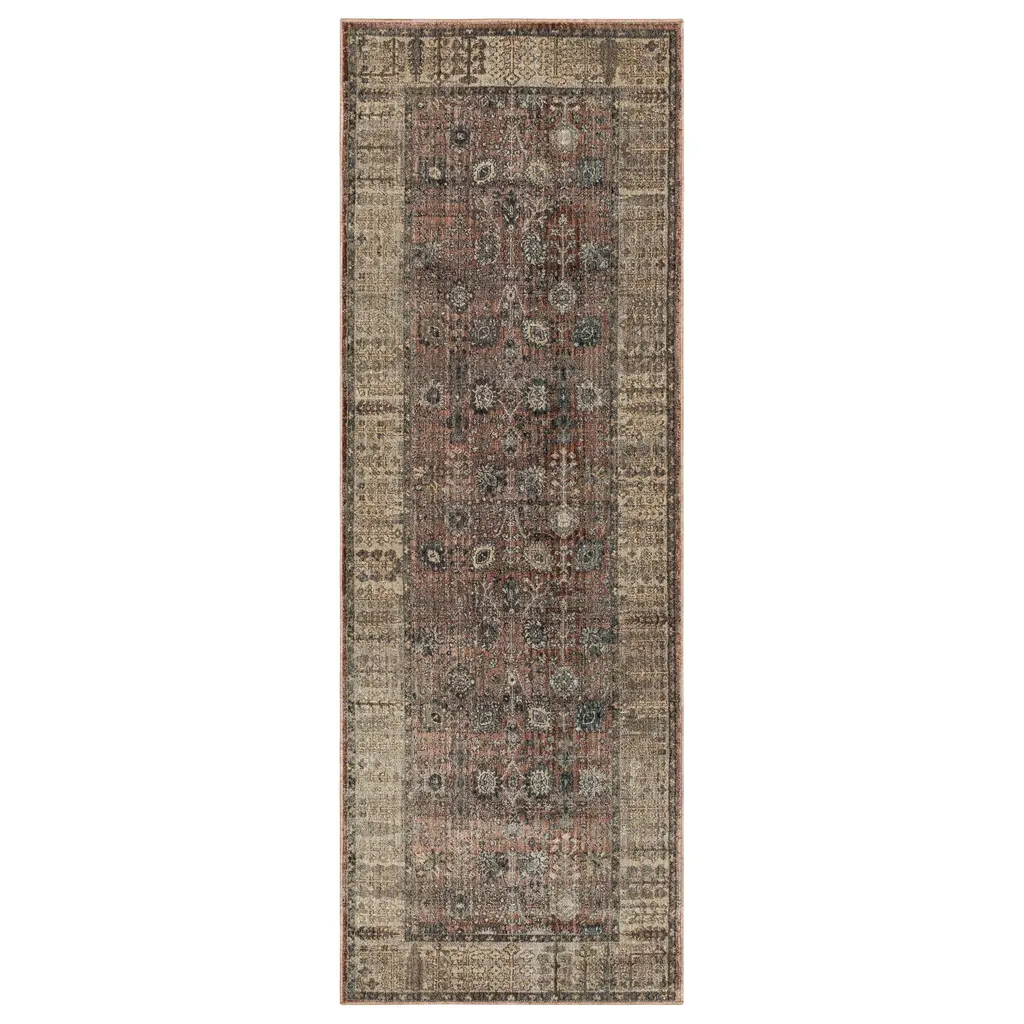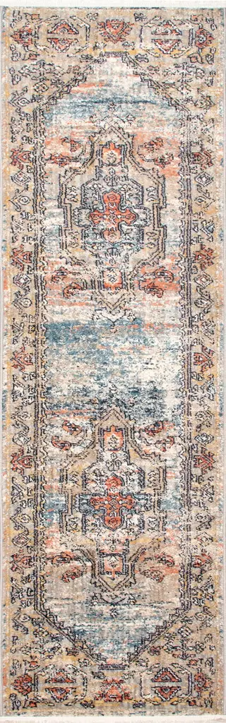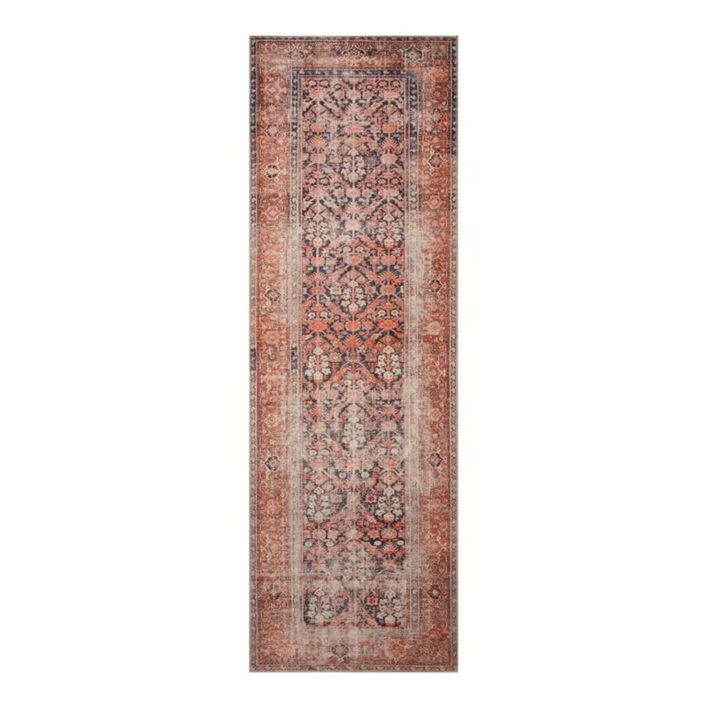 Featuring a luxurious Persian-style design in deep navy and rust, our distressed Izmir floor runner is finely crafted of easy-care polyester with a blanket-stitched border. This exclusive small-space runner rug will not shed and features a nonskid backing that makes it an ideal accent for bathrooms, hallways and kitchens. Soft underfoot, stain-resistant and easy to clean, it's a perfect traditional rug for homes with children and pets.
