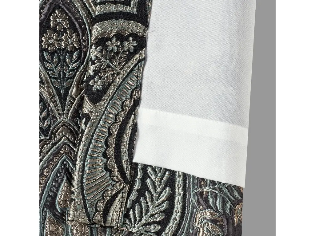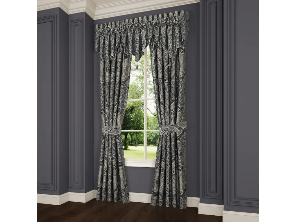 The Vincenzo Window Panels feature a traditional woven damask design in sophisticated colors ranging from black, pewter, metallic gold and teal. The reverse is fully lined to provide darkness for comfortable sleep and relaxation. The finishing touch is the matching tie-backs, which help create an open airy look, and the panels can be paired with the Vincenzo valance to complete your bedroom windows.