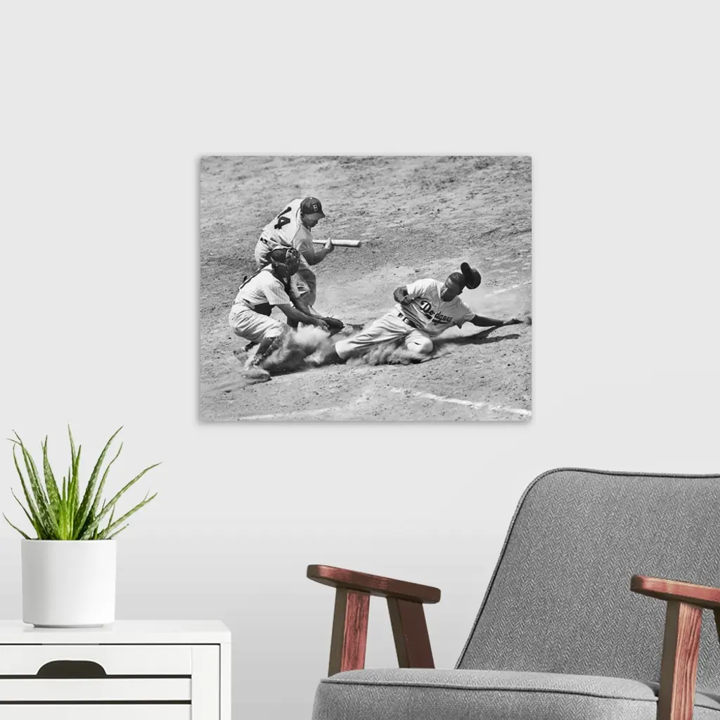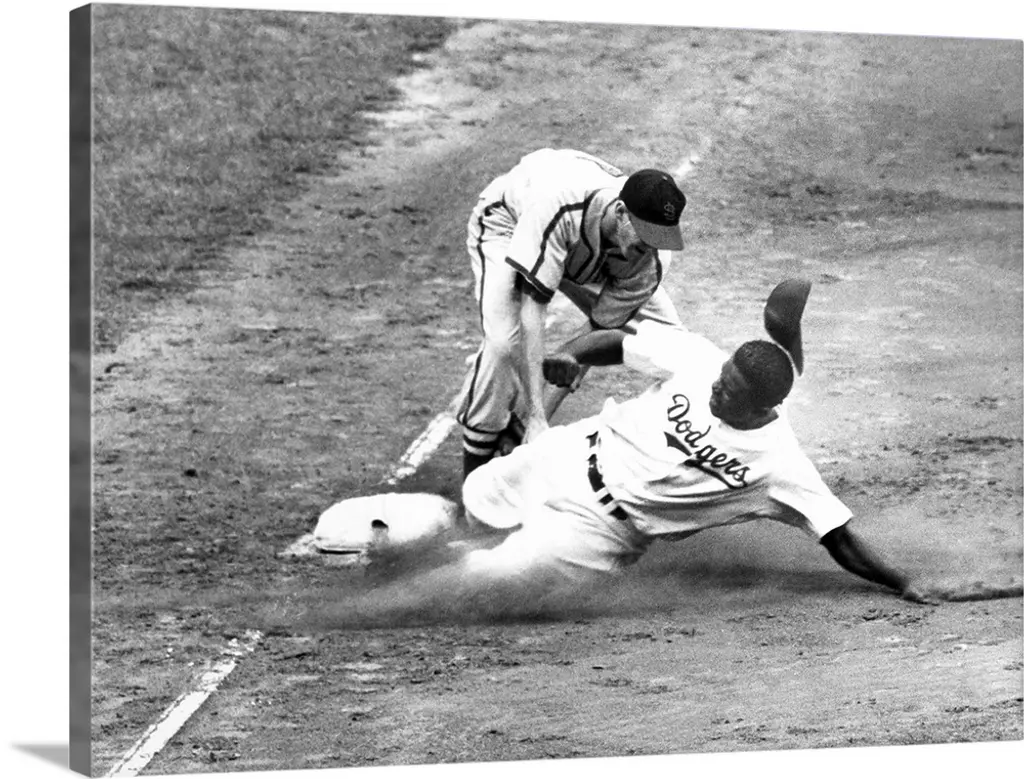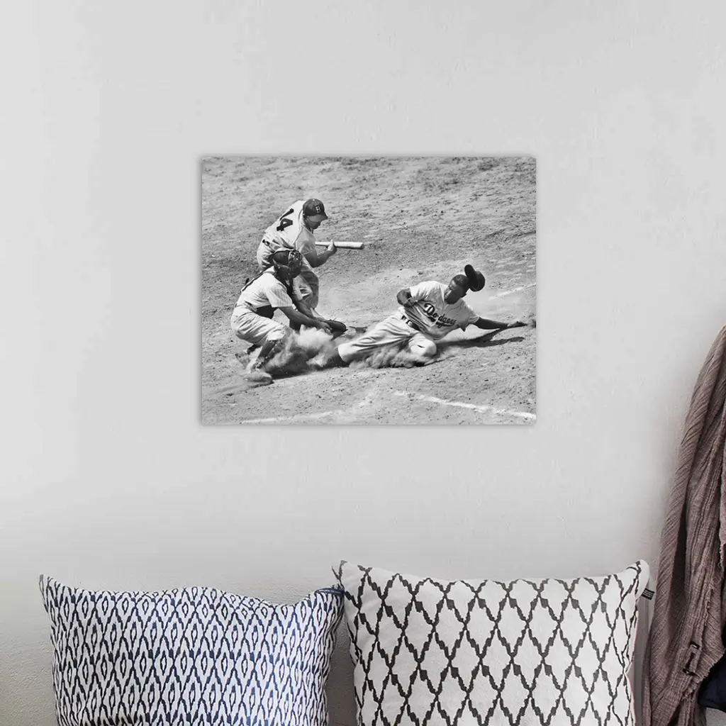 John Roosevelt Robinson, known as Jackie. American baseball player. As a member of the Brooklyn Dodgers, stealing home under the tag of catcher Andy Seminick in a game against the Philadelphia Phillies, at Shibe Park, Philadelphia, Pennsylvania, 2 July 1950. The Dodgers batter is Gil Hodges.