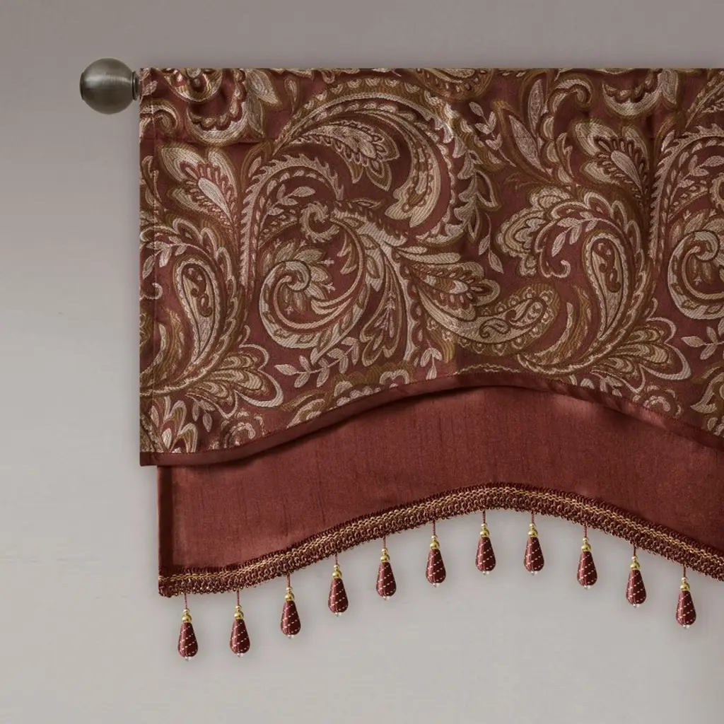 Description For a unique and luxuriously classic style, our Madison Park Aubrey Beaded Valance is the perfect extra touch to your decor. The alluring jacquard weave is inspired from an updated paisley motif and is woven in beautiful hues of burnt red, gold, and a hint of silver for a shimmering accent. The window valance features solid faux silk piecing and flat piping details, while delicately finished with a scalloped bottom design and intricate gold bead trim, creating an intriguing elegant look. This window panel is also OEKO-TEX certified, meaning it does not contain any harmful substances or chemicals, ensuring quality comfort and wellness. Simply hang on rod pocket; fits up to a 1.25 diameter rod. Product Details 50x18" 1 Window Valance:50"W x 18"L Material Face:100% Polyester Jacquard, Lining: 100% polyester, Trims: gold beads;