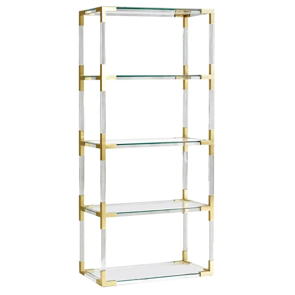 Clearly cool. Our Jacques collection is the perfect blend of simplicity and glamour, modern and traditional. Shown in crystal clear Lucite with brushed brass. Also available in moody smoke acrylic with nickel corners. Fab for books or for displaying your favorite objets, our Jacques étagère has a big presence, but is weightlessly transparent.