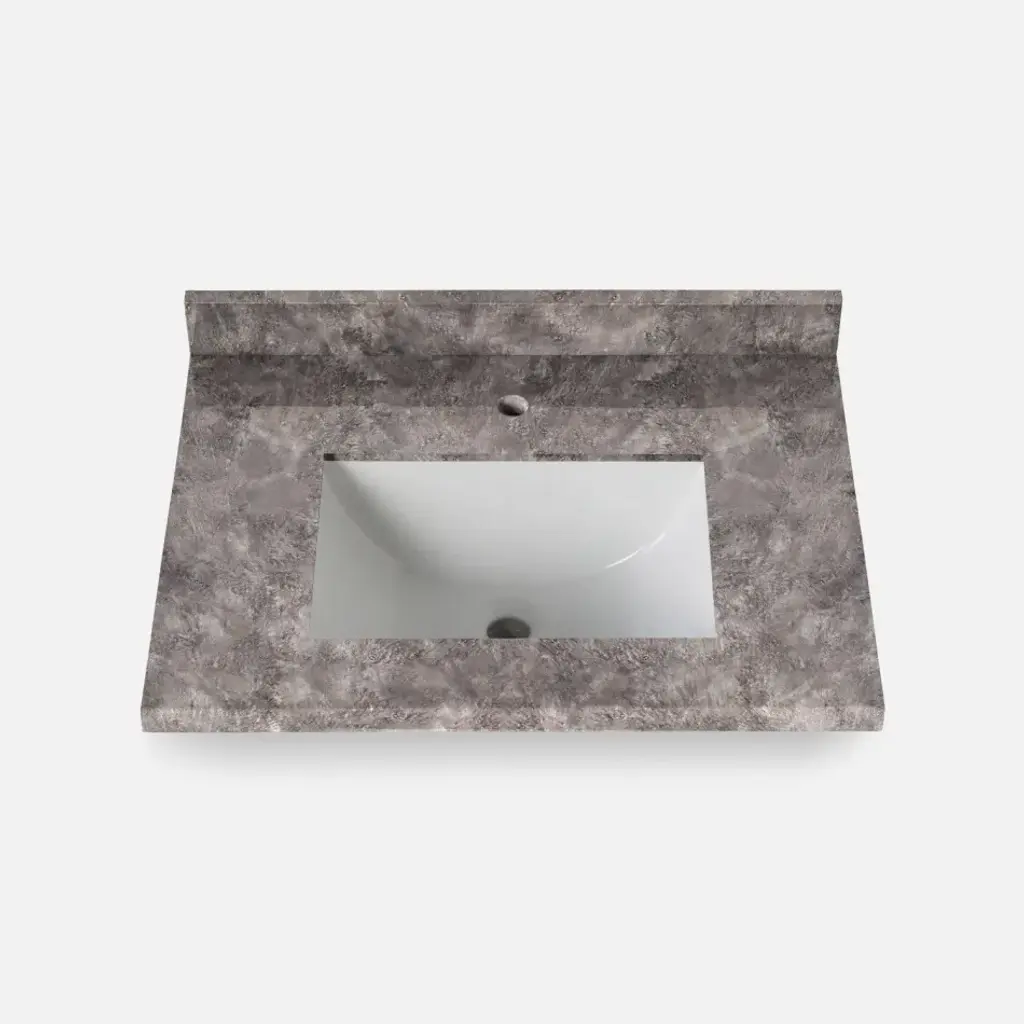 Base: Bold and gorgeously graphic, the same opulent materials and finishes you know and love have traveled over to our new collection of Jada freestanding vanities. Hand-lain panels of banana bark create a naturally striking finish, with a concentric starburst pattern evoking eclectic artistry. Each drawer comes with a lily pad-like knob and an assortment of countertop materials to choose from, like chic pewter burl resin. Split leaf hardware provides the finishing touch. Sink: Available in both powder room and standard sink sizes, our rectangular undermount basins are crafted of premium-quality porcelain.