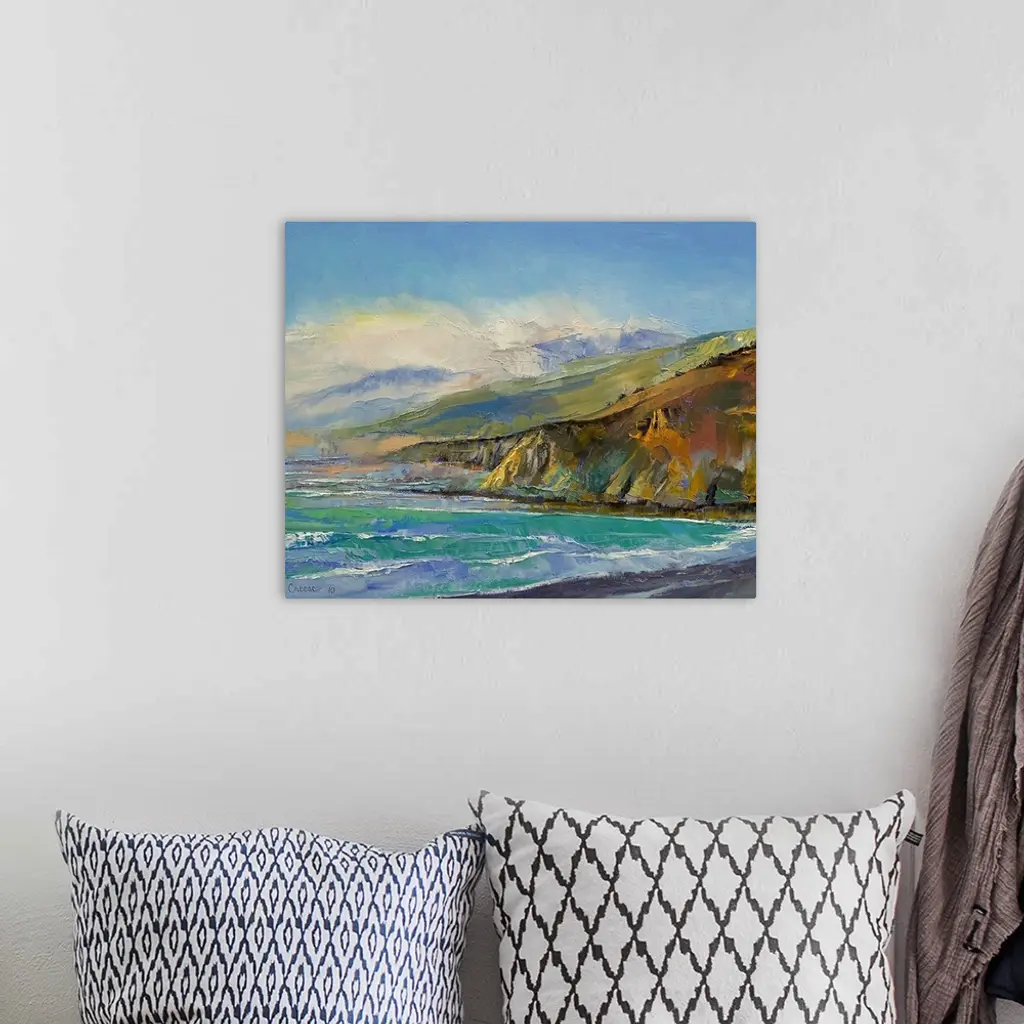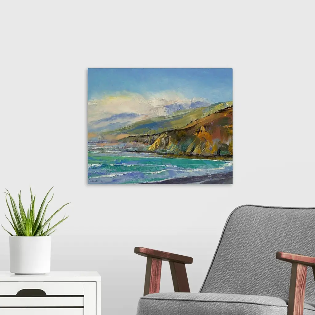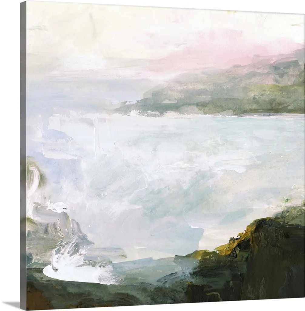 Contemporary oil paint landscape of sea cliffs and waves washing against the shore.