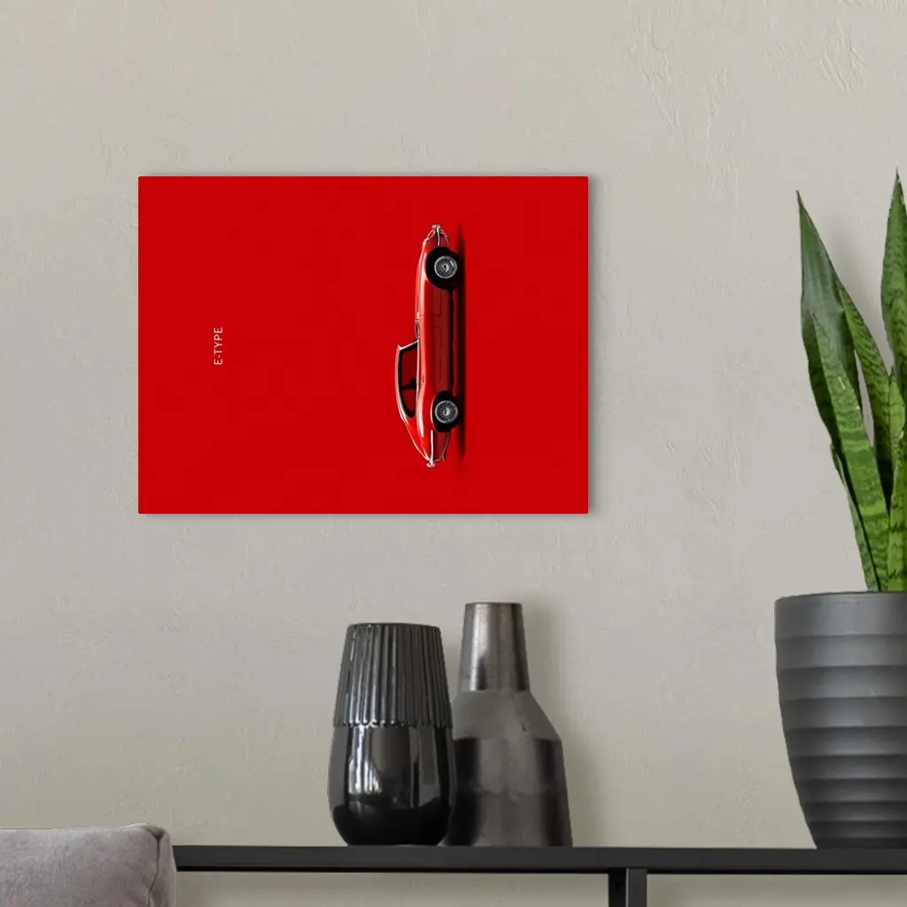 Photograph of a red Jaguar E Type printed on a red background