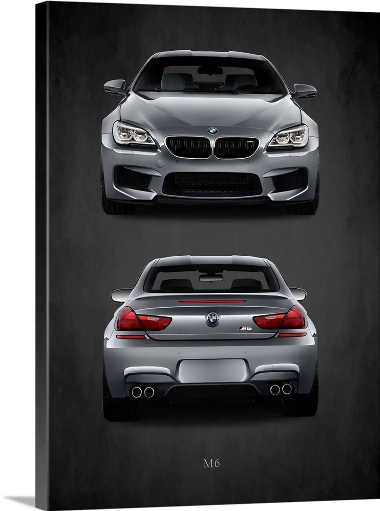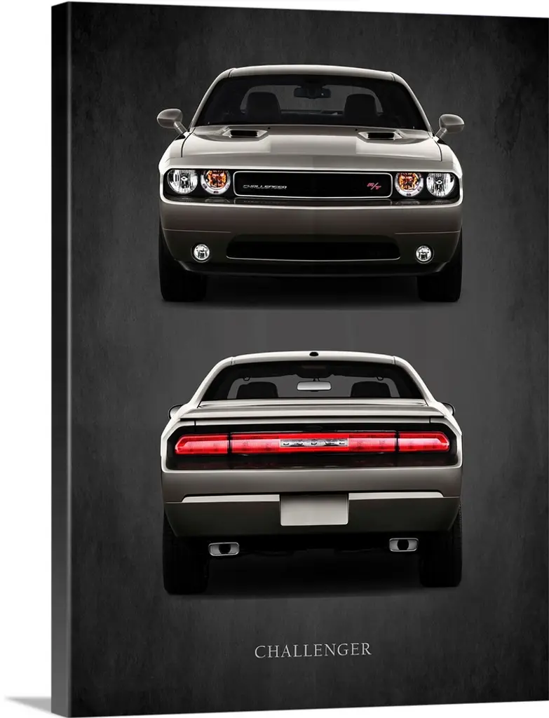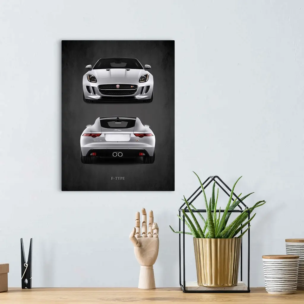 Photograph of the front and back of a silver Jaguar F-Type printed on a black background with a dark vignette.