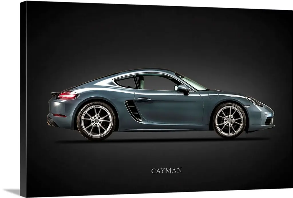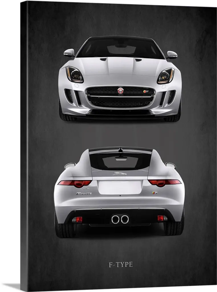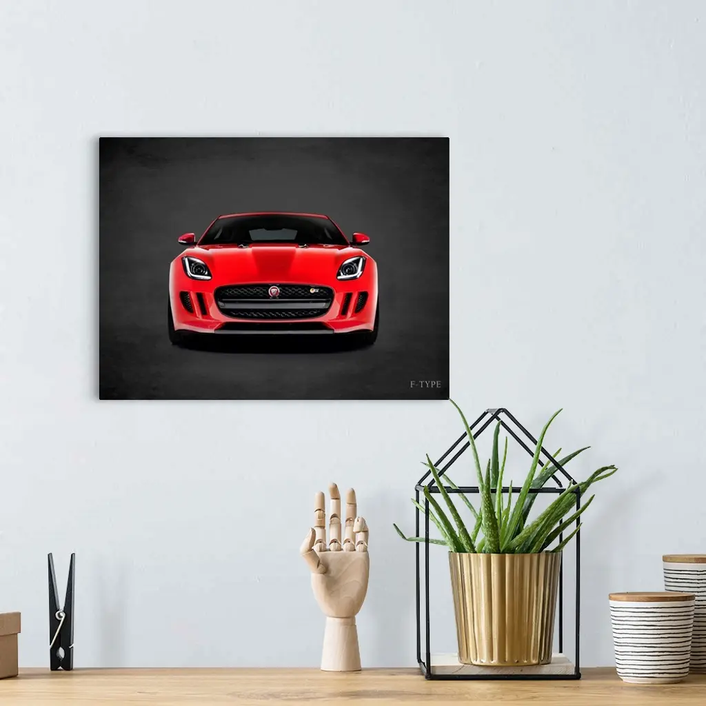 Photograph of a red Jaguar F-Type printed on a black background with a dark vignette.
