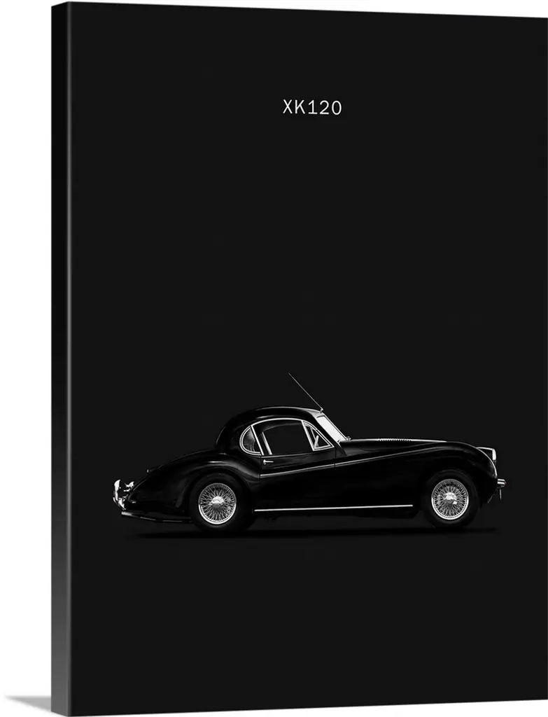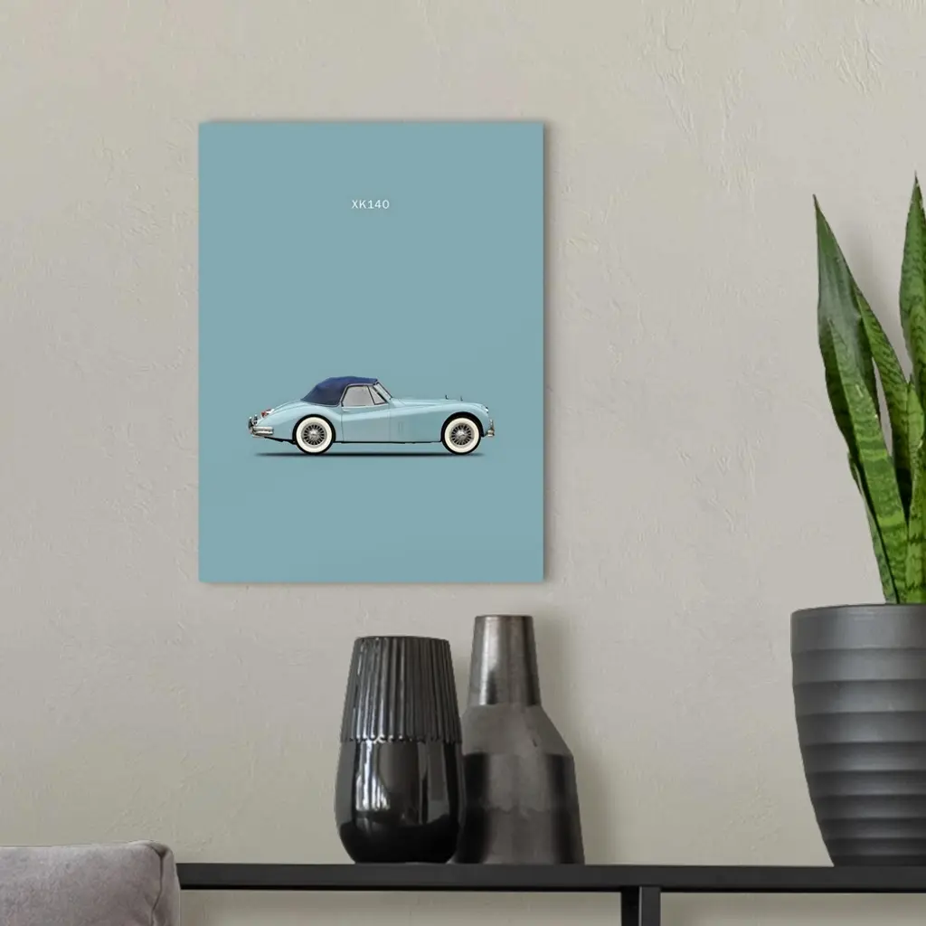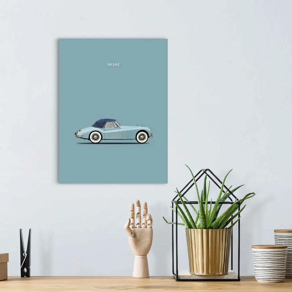 Photograph of a light blue Jaguar XK140 with a dark blue top printed on a light blue background