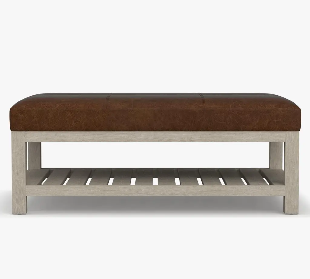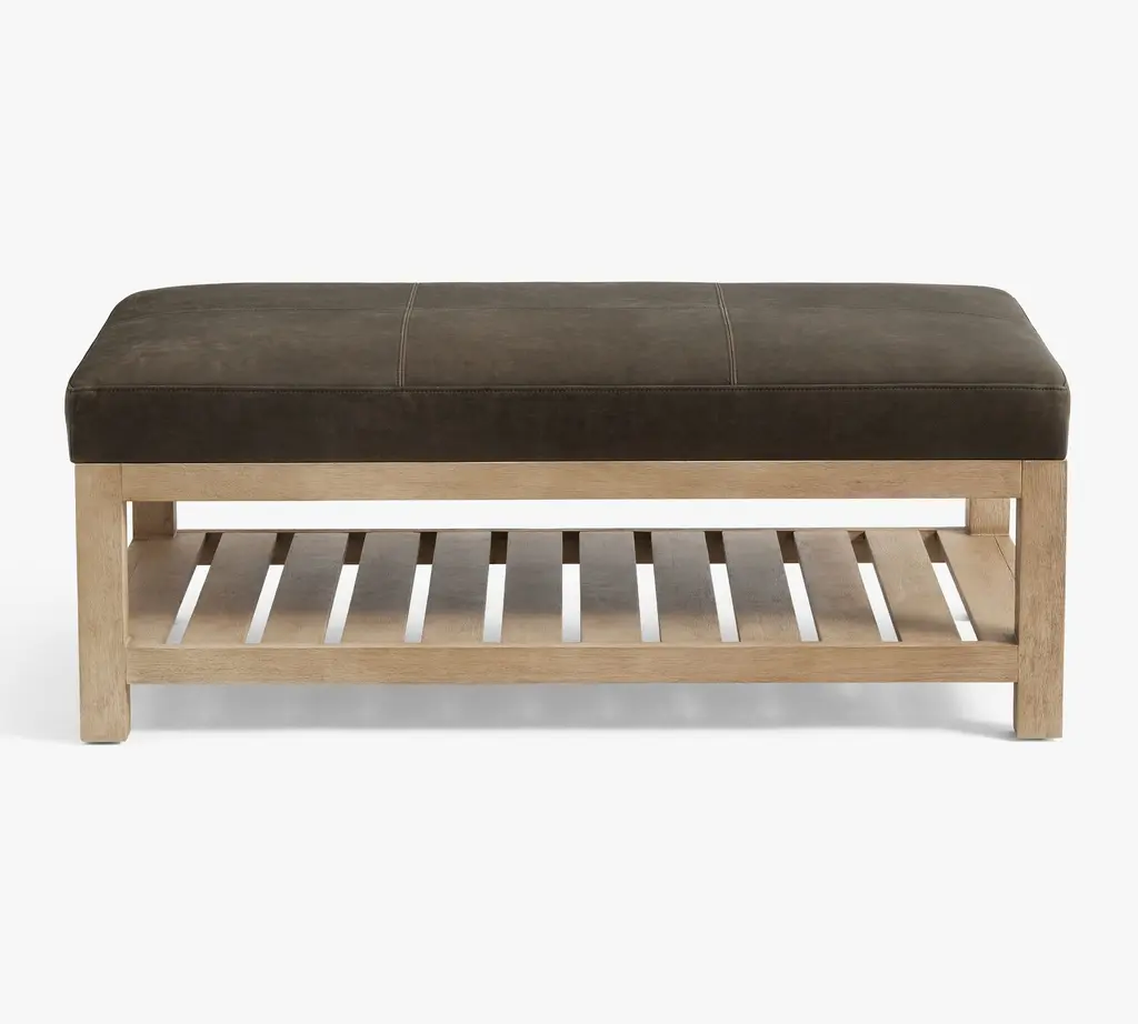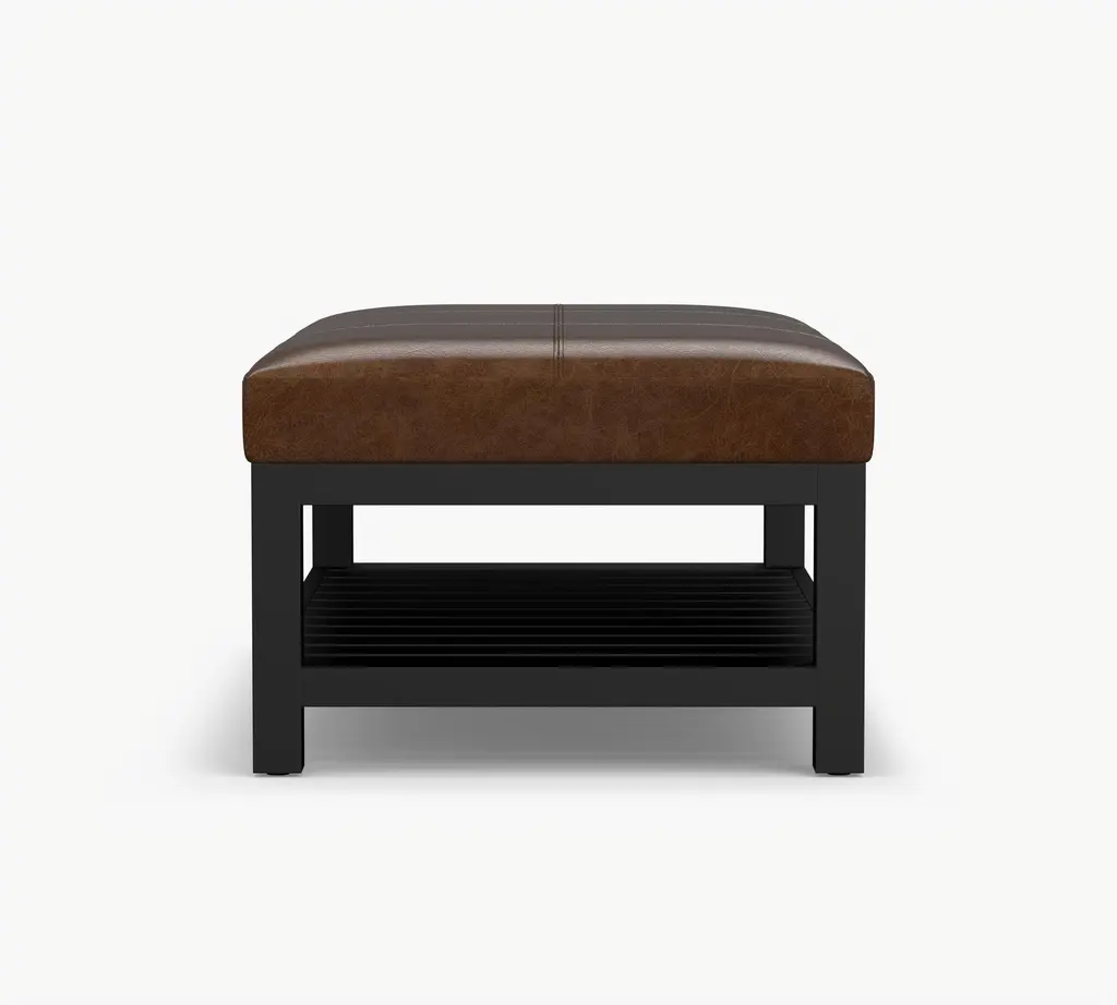 Superb comfort meets a simplified silhouette for a look that's as refined as it is laid back. Covered in your choice of leather, this ottoman is perfect for placing at the end of a bed – it doubles as seating and a coffee table you can use to kick up your feet. The slatted shelf is perfectly sized for books, board games, throws, and more.