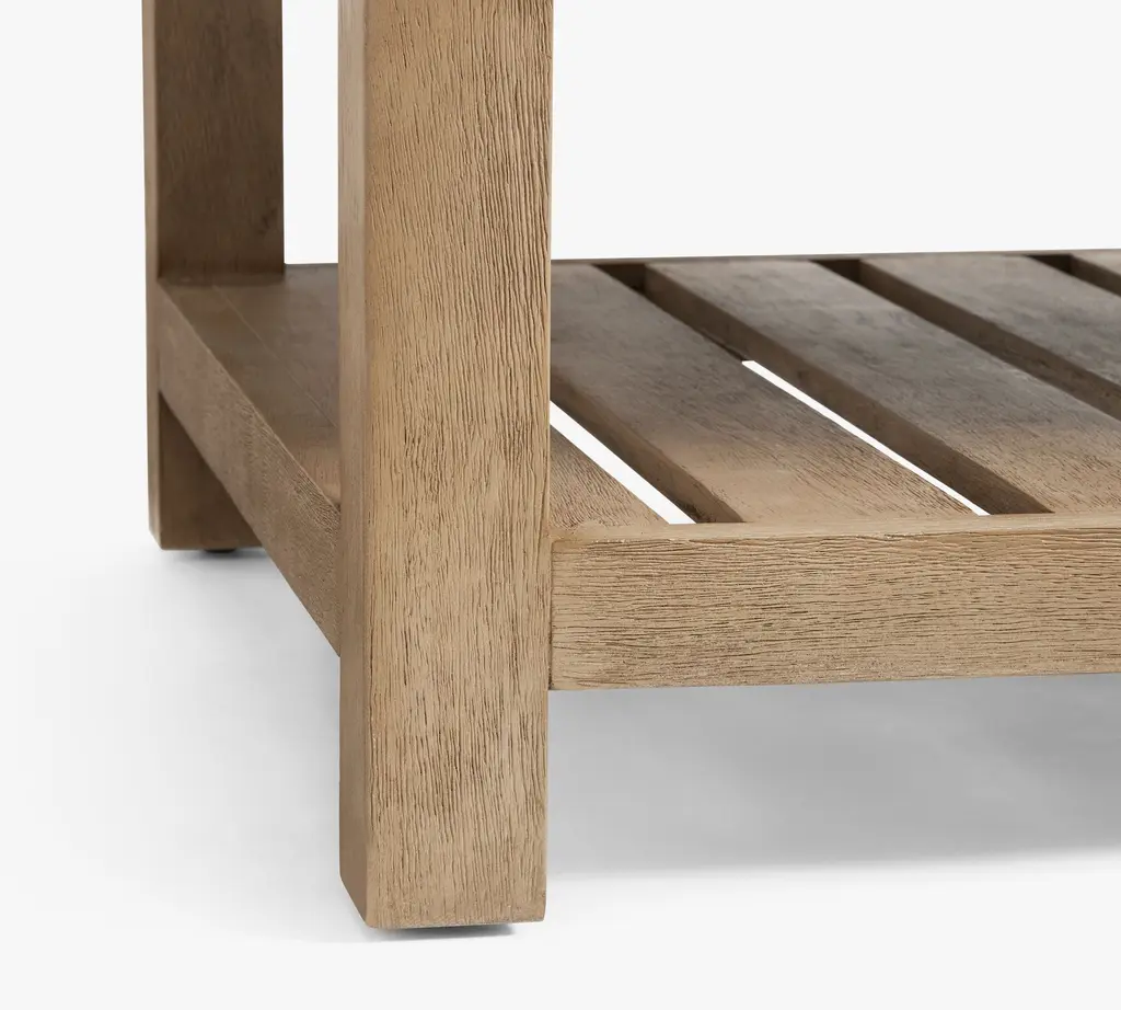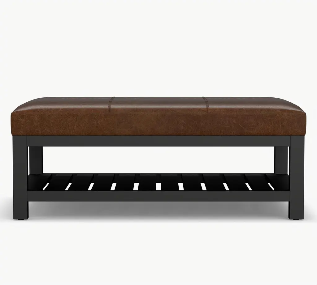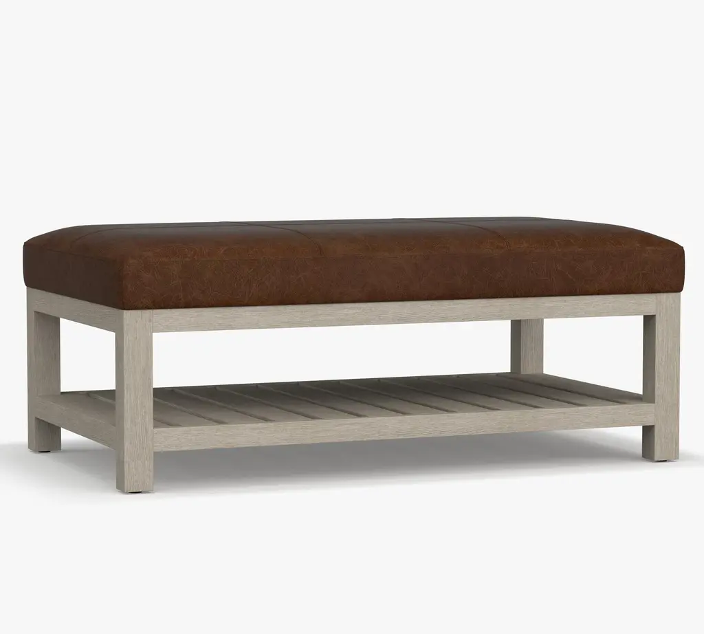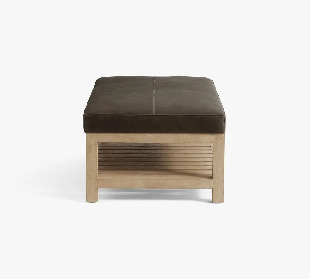 Superb comfort meets a simplified silhouette for a look that's as refined as it is laid back. Covered in your choice of leather, this ottoman is perfect for placing at the end of a bed – it doubles as seating and a coffee table you can use to kick up your feet. The slatted shelf is perfectly sized for books, board games, throws, and more.