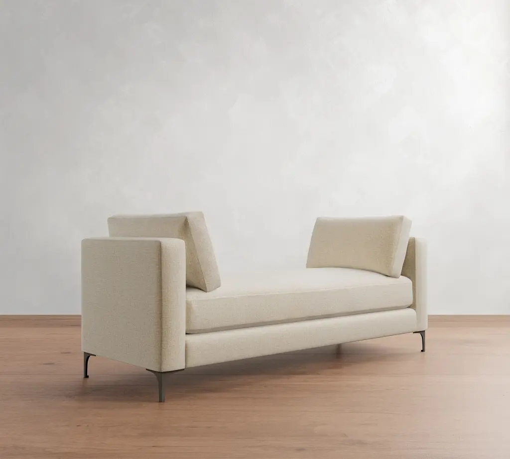 Superb comfort meets a simplified silhouette for a look that’s as refined as it is laid back. Our Jake Collection is defined by its legs – the finished metal gives this a decidedly modern feel. This settee can be used as a daybed or casual lounge spot for a bedroom, foyer, or living room.