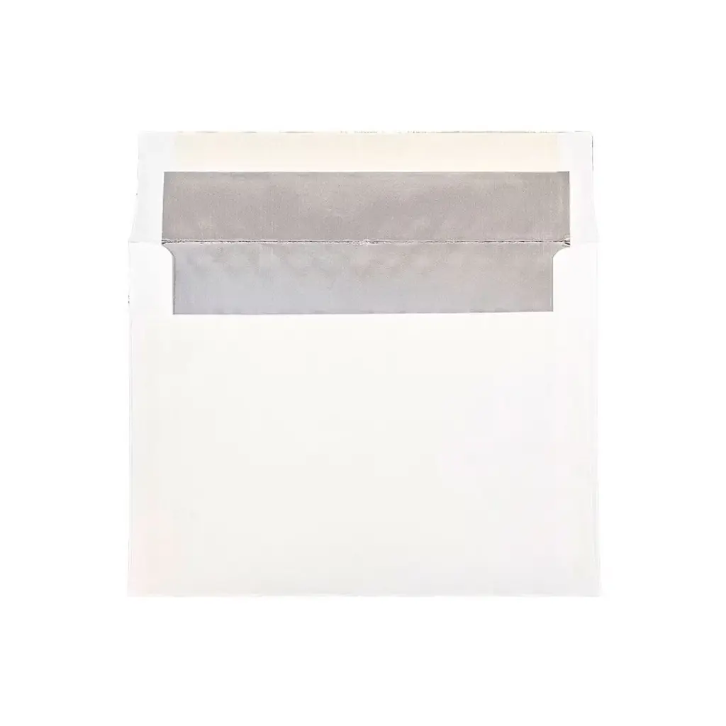 The JAM Paper A7 white with silver foil lined envelope is great to use for announcements and different kind of invitations. JAM Paper White A7 Envelopes with Silver Foil Linings measure 5.25 x 7.25 inches in size. This size makes them ideal for standard sized invitations and greeting cards! Made of high quality, 24lb paper, these envelopes are white and have shining silver foil linings. All recipients to whom these envelopes are sent will notice the elegant silver shimmer when they open their mail! This pack contains a total of 50 envelopes. Each one has a straight flap and reliable gum closure to keep items secure as they are transported through the mail. These envelopes are fantastic for the mailings during the holiday season! Use them to send Christmas cards or invitations to your annual holiday party!. White with sliver foil lined envelope. Blank interior for personalized message. Envelope Size: 5.25" x 7.25". Paper Weight: 24 lbs. Pack includes 50 envelopes.