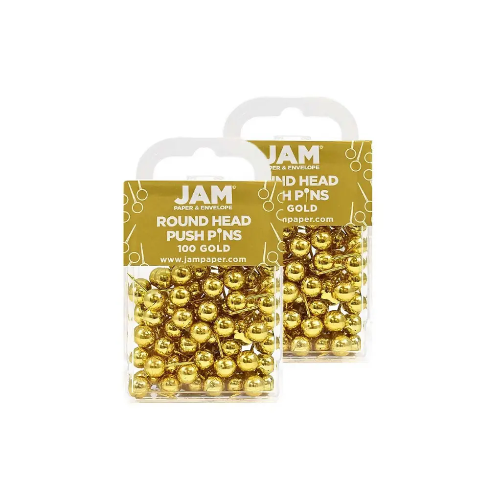 JAM Paper Gold Round Head Push Pins feature a bright and brilliant gold color! Each of these pins is composed of a durable plastic round head and a sturdy, sharp pointed steel post. The shiny, beautiful and elegant gold color of these push pins will bring a touch of glamour and class to your work space, dorm room, or home! Use these round gold thumb tacks to mark destinations on a map, to fasten notes and reminders to your memo board, to create fun and interesting vision boards, to put up posters or flyers, to attach photos to your tack board, and more!. Thumb tacks have sharp steel points and easy to grasp colorful decorative plastic heads. Size: Standard (approx. 1 inch). Great pushpins to use at home, the office, or in the classroom on corkboards, bulletin boards, and cubicle walls. Thumb tacks. Sold as 2/Pack.