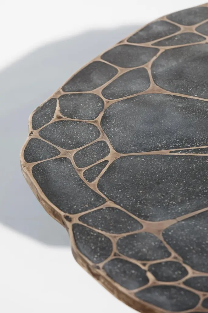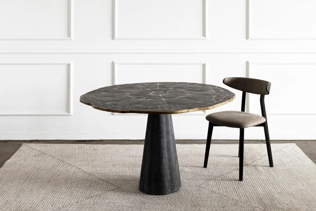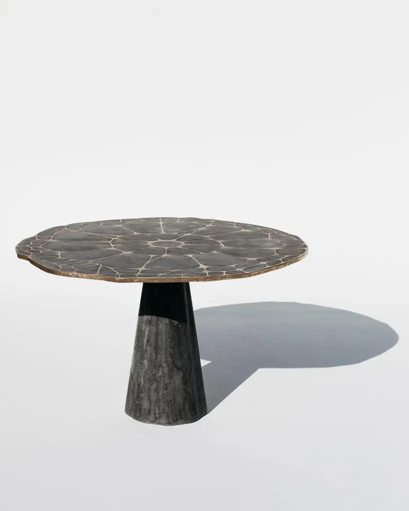 The EXO series is an exploration of nature's growth patterns on design materials, to understand the structure of exoskeleton. The project was conceived from a culmination from James de Wulf's 16 years of concrete knowledge; from the gravity joints to the seamless finish. The beauty of Bronze, ductile and resistant to corrosion, married with the strength, porosity, and density of concrete, create the perfect union. Each material benefits from the other's properties. With the union of these two materials in this patented process, tables are stronger, thinner, and more unique."The design is based on the skeletons of Radiolaria which are microscopic organisms found on the ocean floor. The outer edge of the table meanders in an organic way rather than staying in a rigid circle. The leg does as well. In this way we keep the piece human, approachable and fun; rather than adhering to the rigidity of a circle." - James de Wulf. At 60" diameter, the table weighs 400 lbs. The piece lives beautifully indoors and performs well outdoors. Tables are sealed with a unique finishing wax and will develop a gradual patina adding to the beauty of the material’s character over time.Standard diameters 48" / 60" / 72" / 84" available. Please inquire for custom sizing.