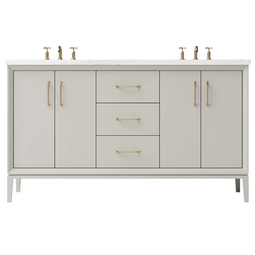 Included Components: Covered under James Martin Vanities' 1 year limited warranty Plywood and wood veneer vanity cabinet with 2 doors and 3 drawers Stone composite vanity top with two porcelain sinks Faucet is not included and must be purchased separately Cabinet Features: Constructed from plywood and wood veneer providing a lifetime of durability Wall mounted installation - vanity attaches to the wall creating a floating appearance for a modern look Double door design provides easy access to storage space 3 full extension drawers with soft-close slides allow for organized storage Soft close drawer slides operate on smooth ball-bearings and prevent drawers from slamming shut Vanity cabinet includes matching decorative hardware Vanity Top Features: Stone composite vanity top includes sinks Single pre-drilled faucet hole per basin Each sink features its own rectangular single basin workspace Center drain location provides optimal draining capability Cabinet Specifications: Number of Doors: 2 Number of Drawers: 3 Vanity Top Specifications: Vanity Top Width: 59" (left edge to right edge) Vanity Top Depth: 19-1/2" (front edge to back edge) Number of Basins: 2 Sink Dimensions: 6"H x 18-1/8"W x 47-1/4"L Sink Basin Dimensions: 19-5/8" L x 10-1/4" W x 5-1/8" D Number of Faucet Holes: 1