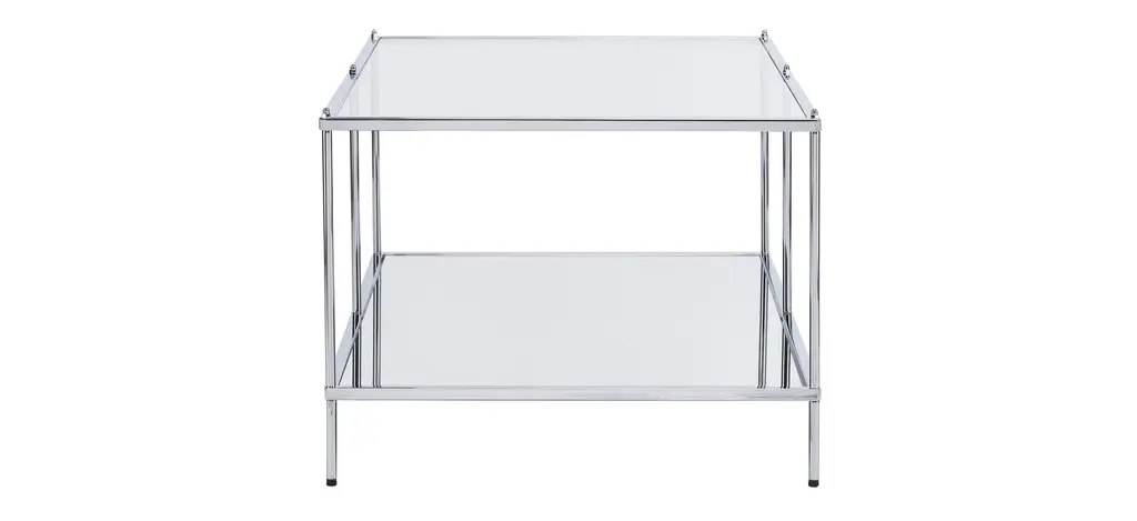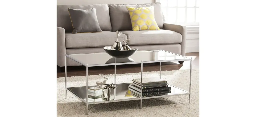 Jameson Cocktail Table create a glam world, all your own, with this chic cocktail table. Simple silhouette sets mixed materials composition in the spotlight. Sleek, shining chrome pairs with reflective mirror and glistening glass, crafting a vision of lustrous luxury. Shelve your clutter with the expansive mirrored shelf and display your favorite fresh flowers and serving tray on the spacious glass tabletop. Conjure a dash of Hollywood elegance with this energizing cocktail table in the living room, den, or open concept space.