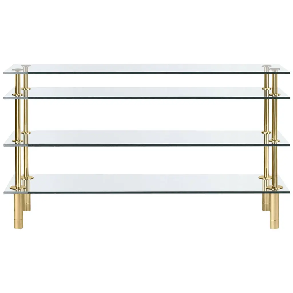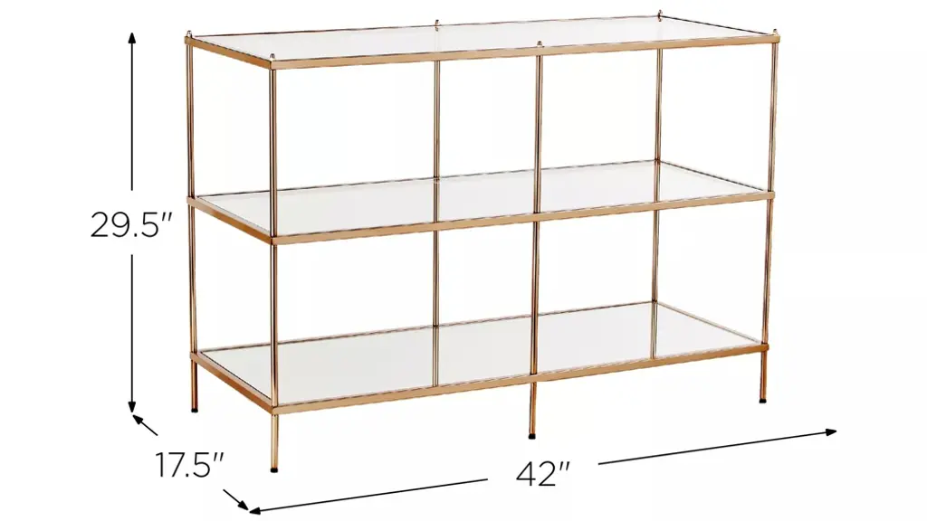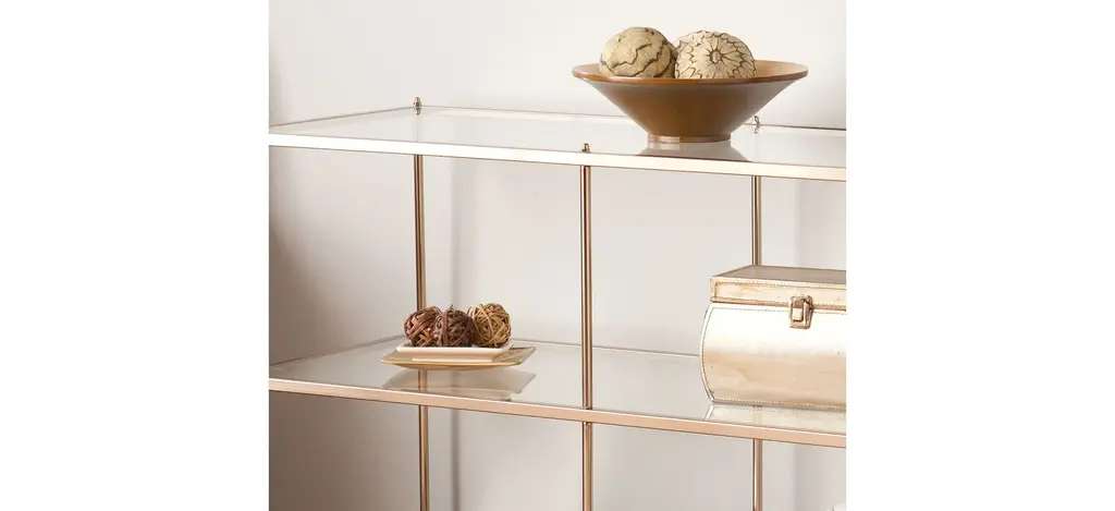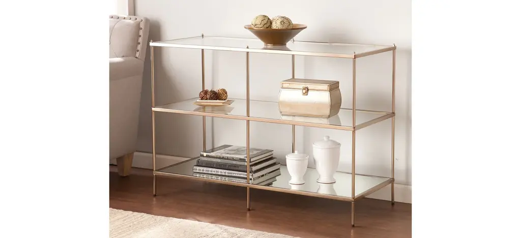 Old Hollywood glam meets modern functionality with this Jameson Console Table. Blushing gold frame hosts shimmering mirrored and glass shelves, proudly displaying everything from board games and media equipment to kitchen utensils and cookware. Slip this multitasking console under a wall-mounted TV for a sophisticated entertaining space, into the dining room as a sparkling buffet, or in the bath for elegant linen storage.